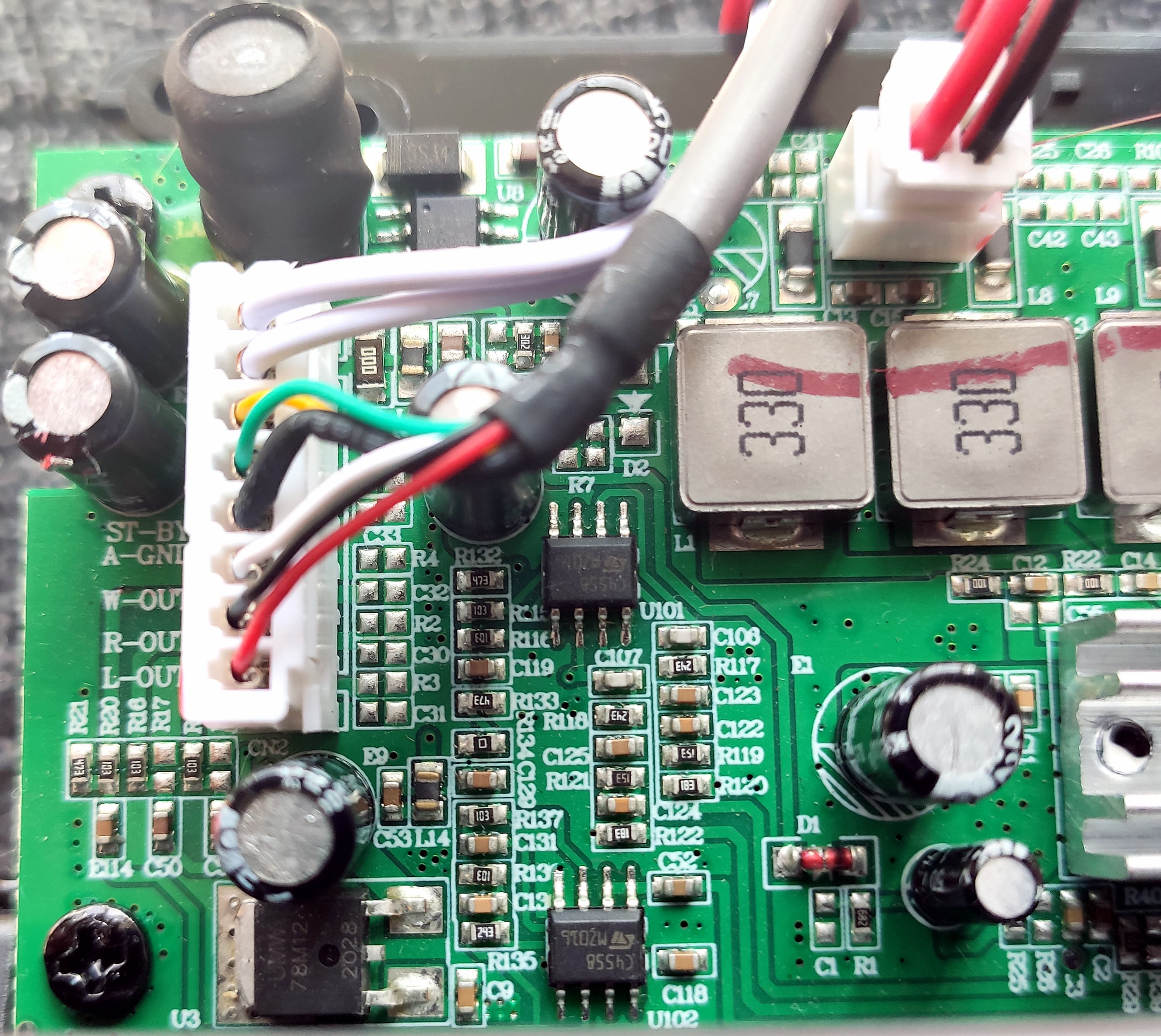 Собрано все вполне качественно, в левой средней части платы расположена пара усилителей C4558. Выше виден преобразователь DC/DC.