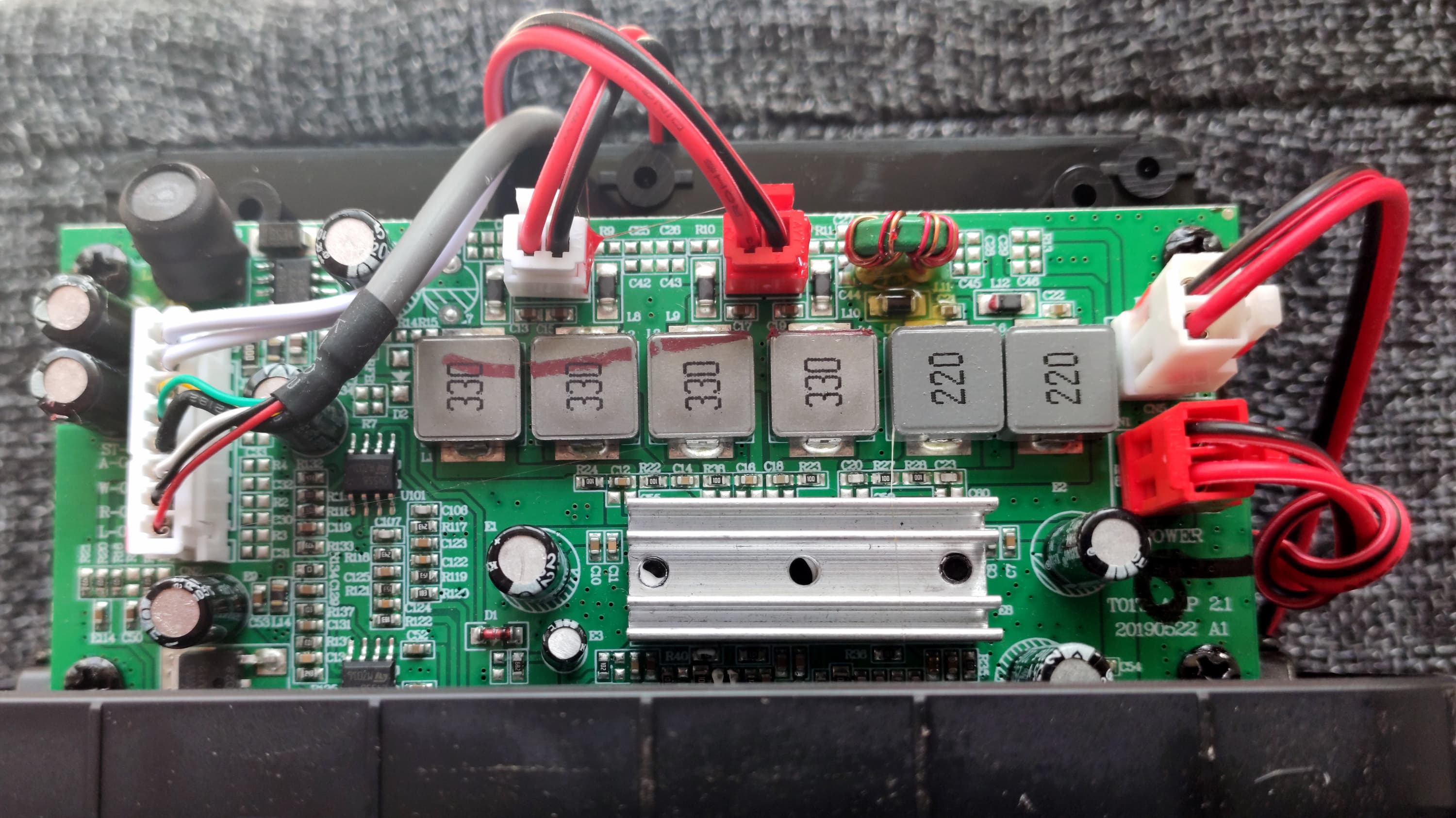 Про количество и параметры используемых динамиков тоже ничего не сказано. Нам удалось увидеть лишь центральный — видимо, СЧ. Маркировка на нем неразборчива, но «50W» различить можно легко. Закреплен динамик с помощью шурупов, вкрученных прямо в накладку изнутри корпуса, которая удерживается парой маленьких брусков, приклеенных к боковым стенкам. Решение, возможно, не самое изящное. Но простое и в целом надежное, а потому вполне имеющее право на жизнь.
