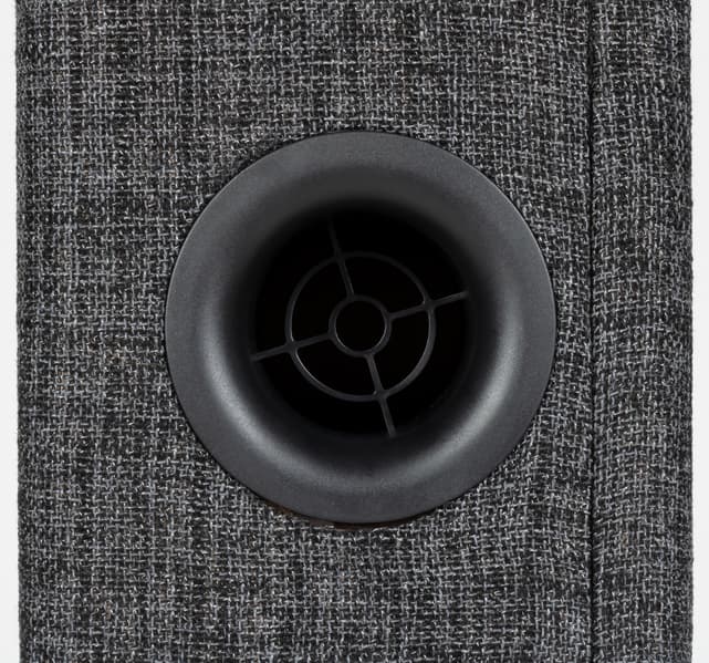 Двигаемся еще ниже и обнаруживаем закрытое изнутри пластиковой сеткой отверстие фазоинвертора диаметром порядка 60 мм. Сразу отмечаем, что ставить акустику вплотную к стене — не очень хорошая идея.
