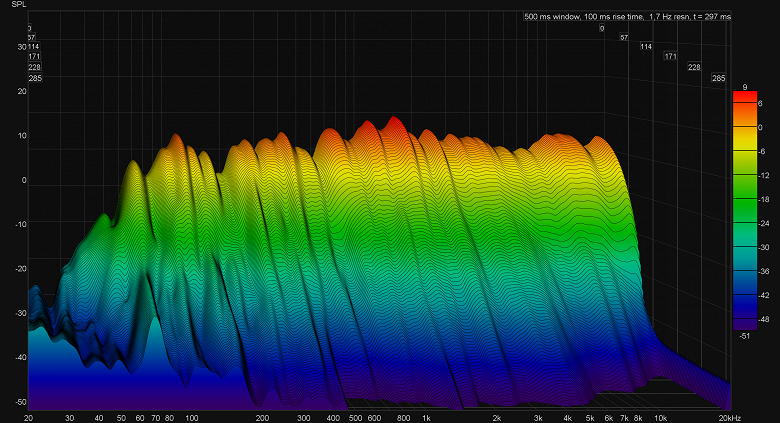 Как говорится, нагляднее не придумаешь. Более-менее полноценное воспроизведение низкочастотного диапазона стартует где-то с 70 Гц, при этом «горб» в районе 120 Гц и провал около 200 Гц добавляют немного «ударности» басу, но в то же время создают ощущение гулкости. А теперь давайте сразу посмотрим на график кумулятивного затухания спектра (он же «водопад», waterfall).