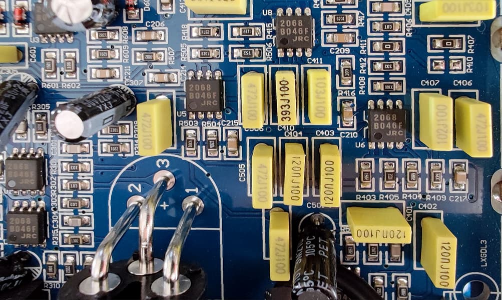 Всего платы две. На той, что расположена ближе к верхней части корпуса, мы видим операционные усилители JRC 2068, ну и прочие компоненты, рассмотреть которые можно кликнув по картинке для увеличения.