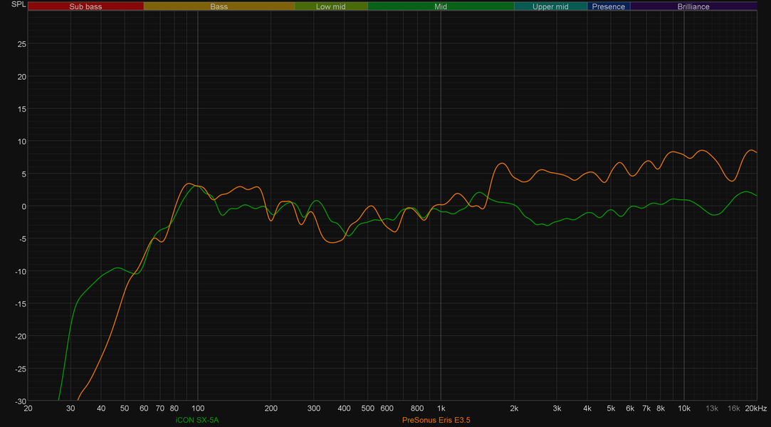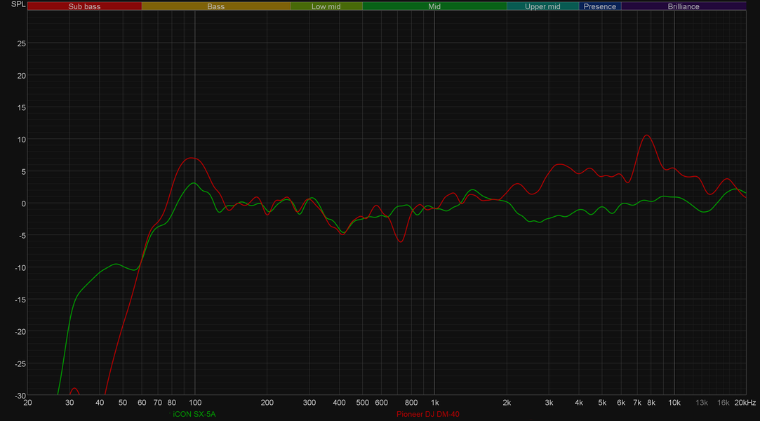 Ну и под конец мы не могли отказать себе в удовольствии сравнить графики АЧХ iCon SX-5A с графиками парочки протестированных мониторов. PreSonus Eris E3.5 основательно более компактные и стоят подешевле, а вот Pioneer DJ DM-40 (обзор мы подготовим в ближайшее время) вполне сравнимы и по габаритам, и по стоимости. Комментировать иллюстрации смысла нет — все и так прекрасно понятно.