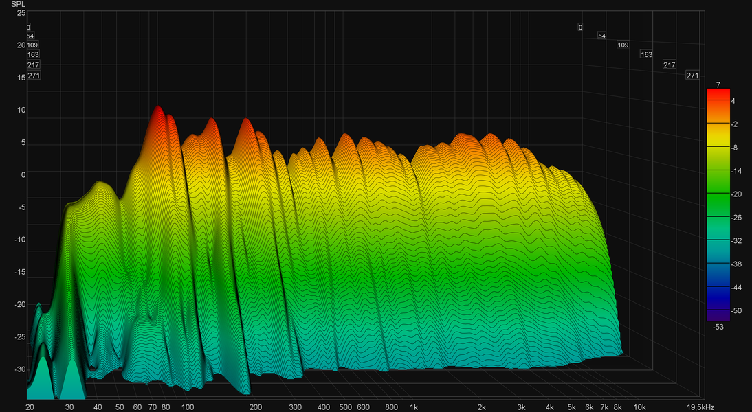 Воспроизведение низких частот действительно стартует в районе 45 Гц, как и заявлено в документации к мониторам. На эту же частоту, если верить описанию устройства от производителя, настроен фазоинвертор. Он выведен назад, потому график не полностью отражает возможности мониторов в НЧ-регистре. В районе 100 Гц мы видим небольшой акцент, который делает НЧ-диапазон субъективно чуть более плотным. В целом же бас обладает замечательной атакой и не склонен к «гудению», что видно на графике кумулятивного затухания спектра (он же «водопад» или waterfall).