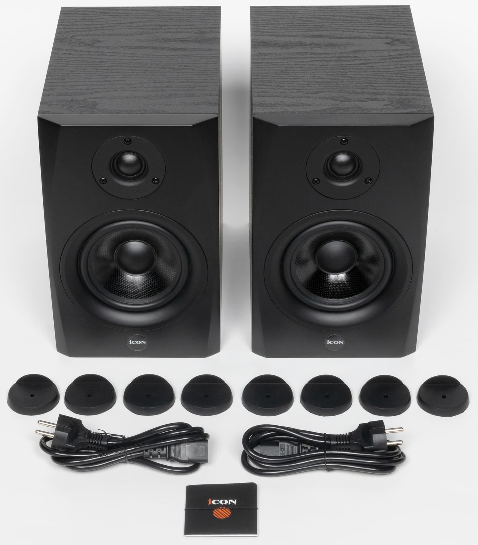 В комплект поставки входят две колонки — в отличие от многих студийных мониторов, iCon SX-5A поставляются парой. Также в коробке мы обнаружили два сетевых кабеля длиной 1,4 метра, инструкцию и два комплекта по четыре ножки для установки акустики.