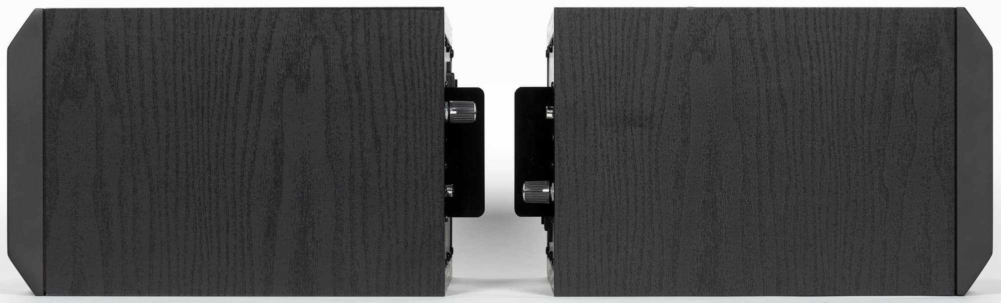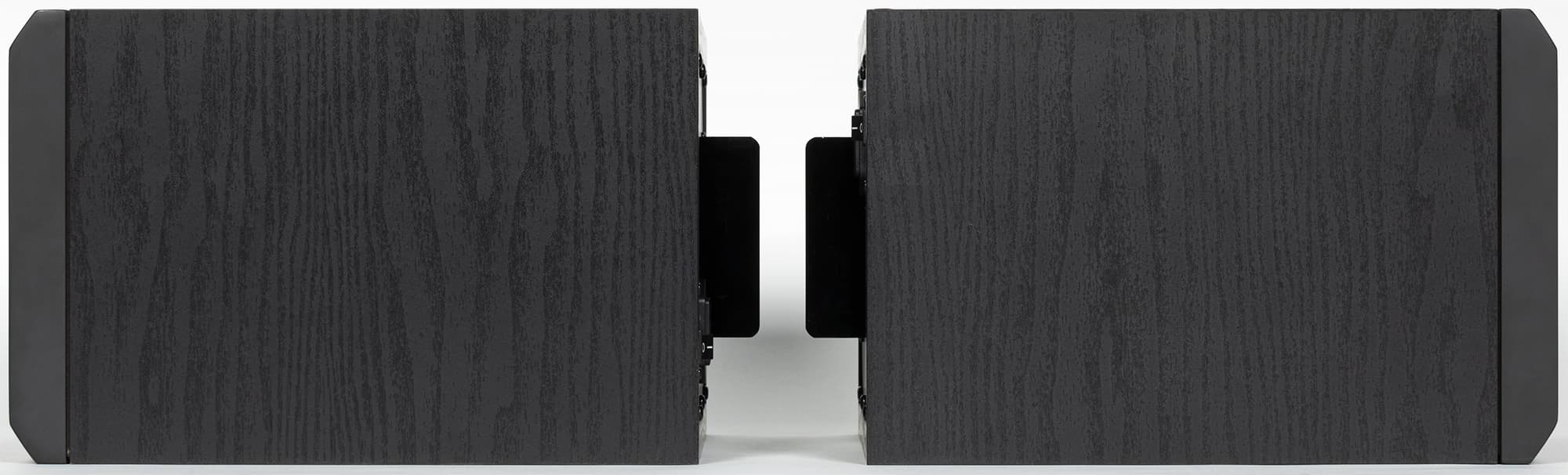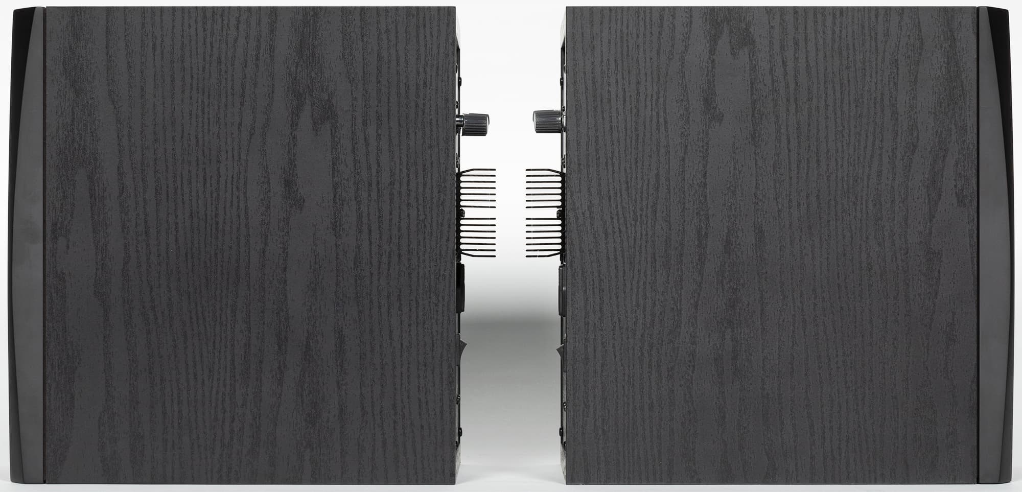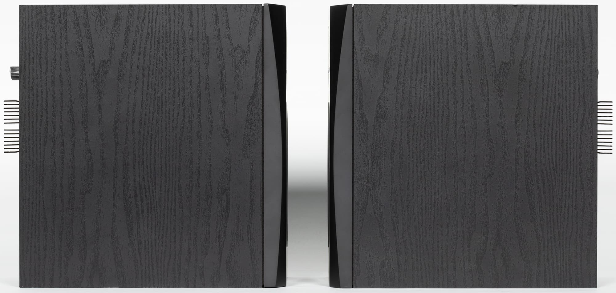 Корпус колонок обтянут черной пленкой с текстурой «под дерево». На боковых стенках нет никаких декоративных элементов.