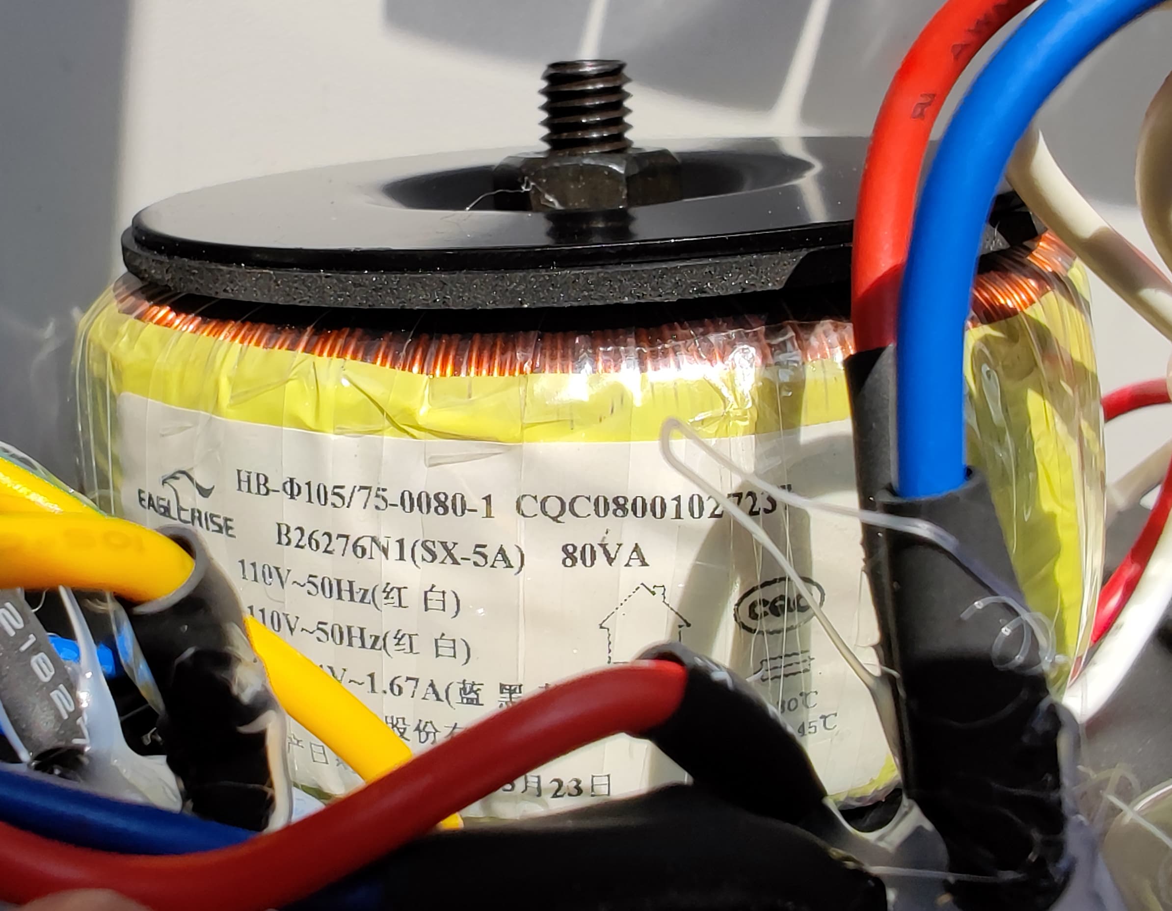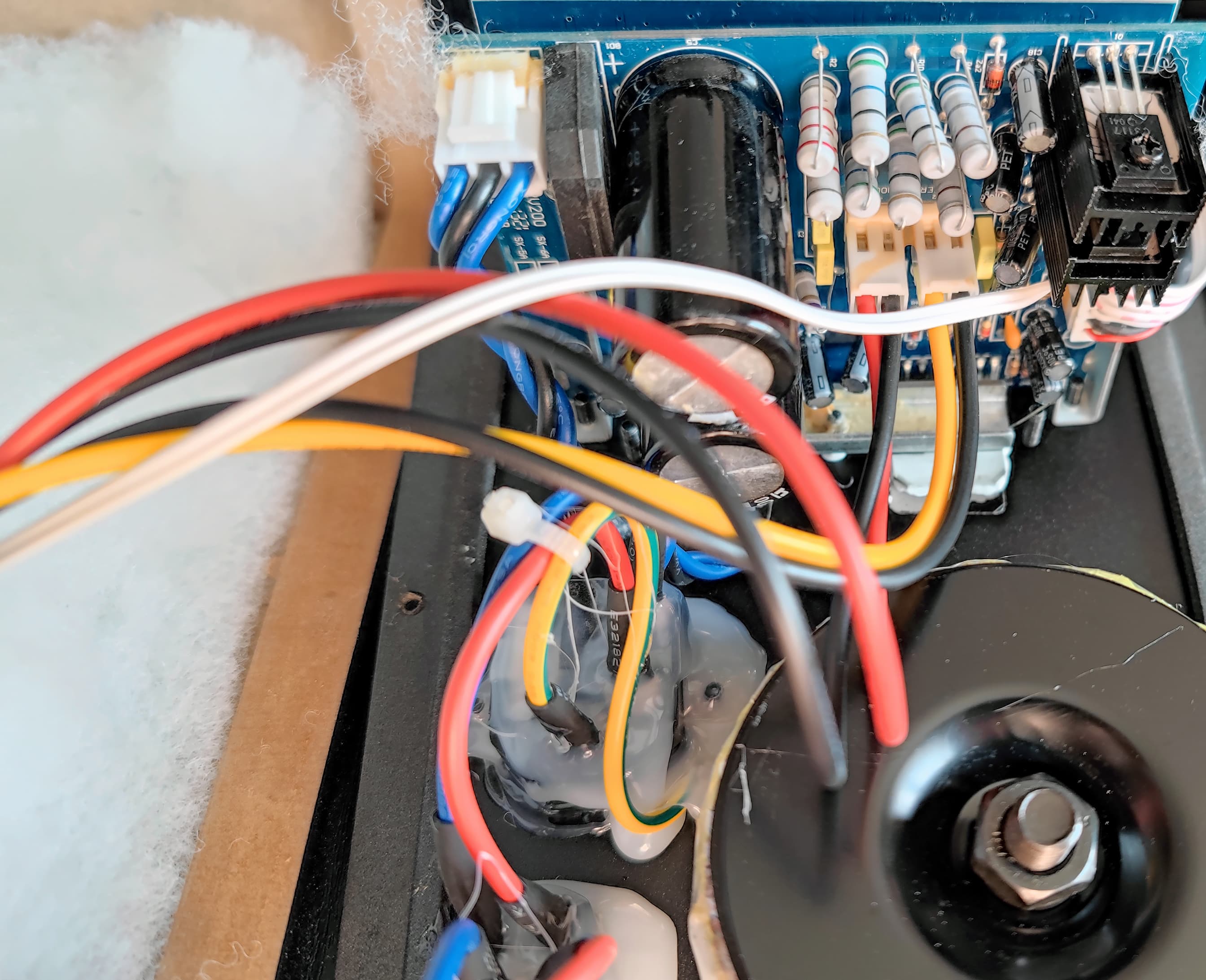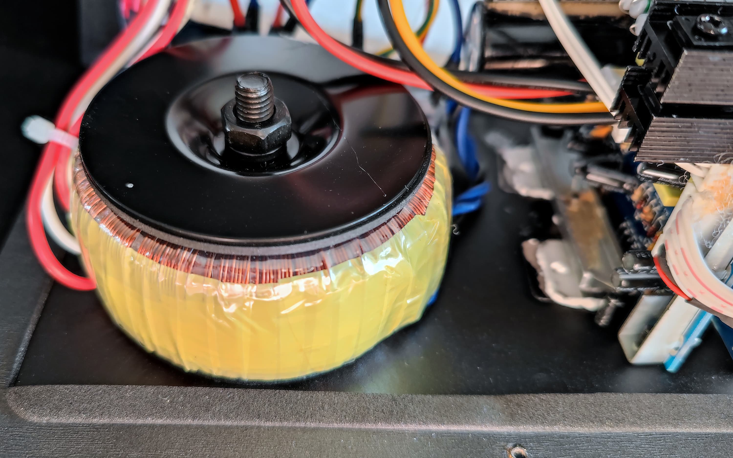 Крупный болт, головку которого мы видели выше, служит для крепления солидных размеров тороидального трансформатора.