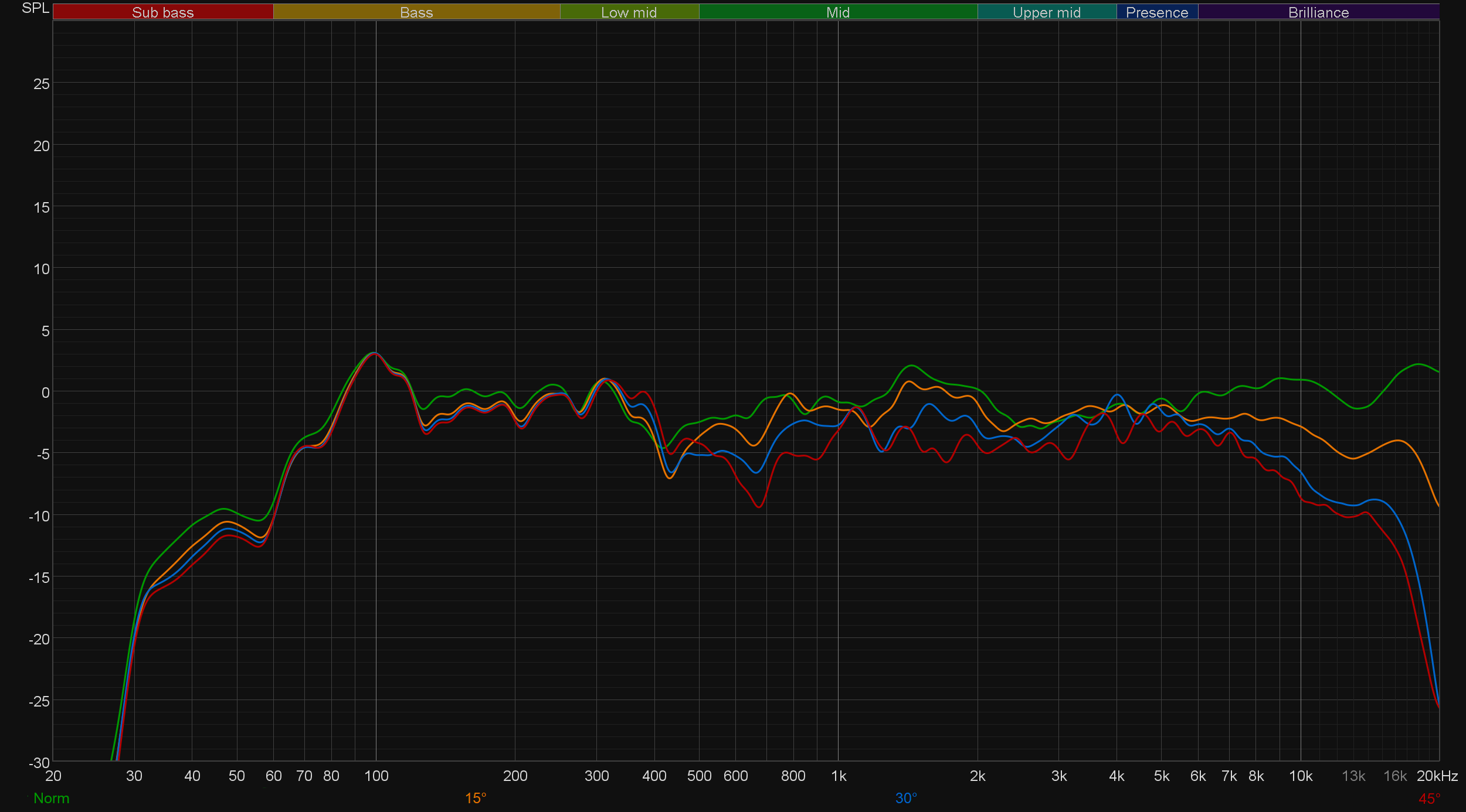 Посмотрим, как обстоит дело с горизонтальной дисперсией звука. Поворот на 15° в сторону от микрофона приводит лишь к небольшому «проседанию» самой верхней части воспроизводимого диапазона — для мониторов ближнего поля это уже очень и очень неплохо. Ну а продолжать уже явно не стоит, что прекрасно видно по графику. Как и всегда, направлять мониторы нужно непосредственно на слушателя.