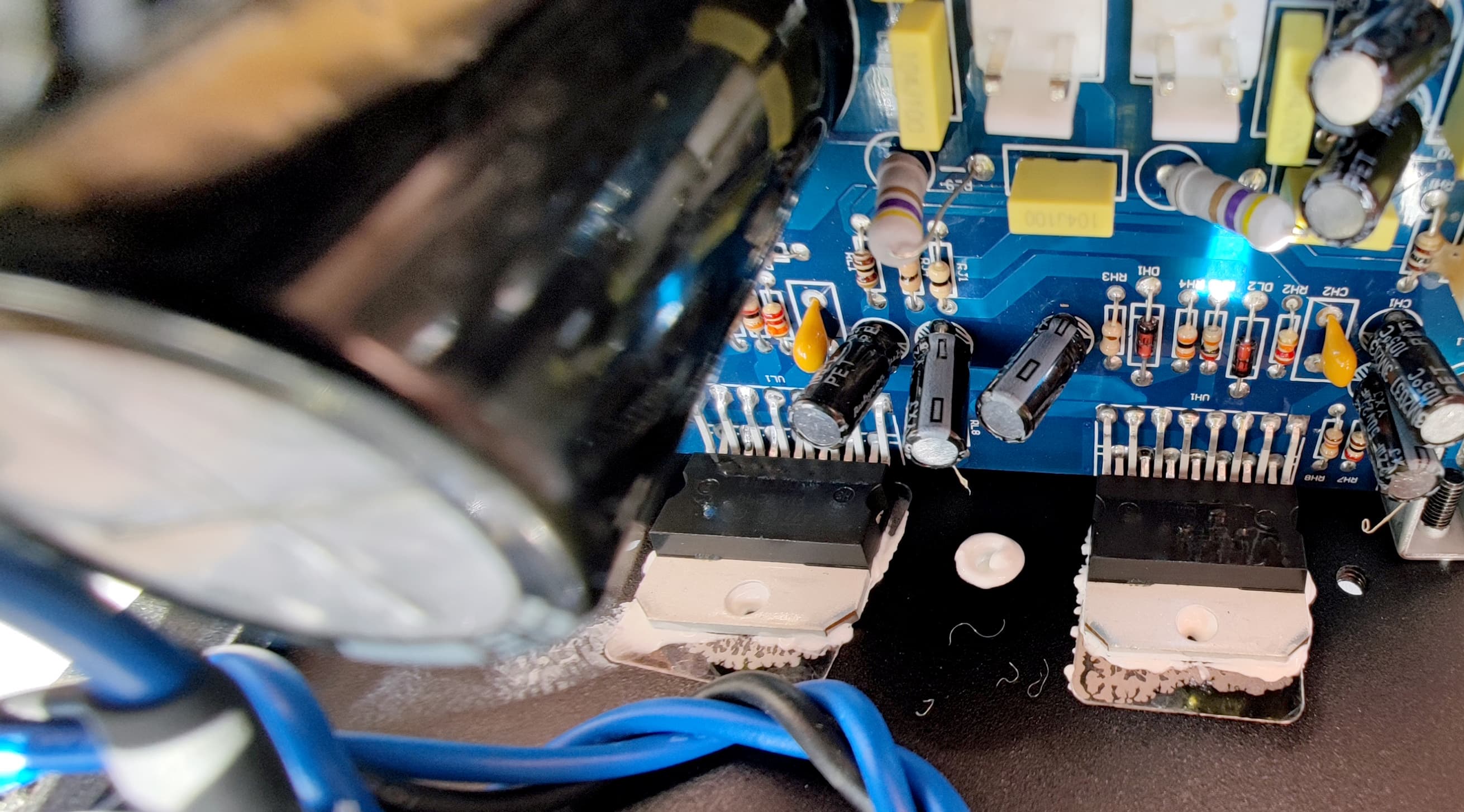 Микросхемы усилителей закрыты планкой, которая прижимает их к радиатору на задней стенке. Снимаем планку, а заодно и сам радиатор — обнаруживаем под ним тонкий слой термопасты.