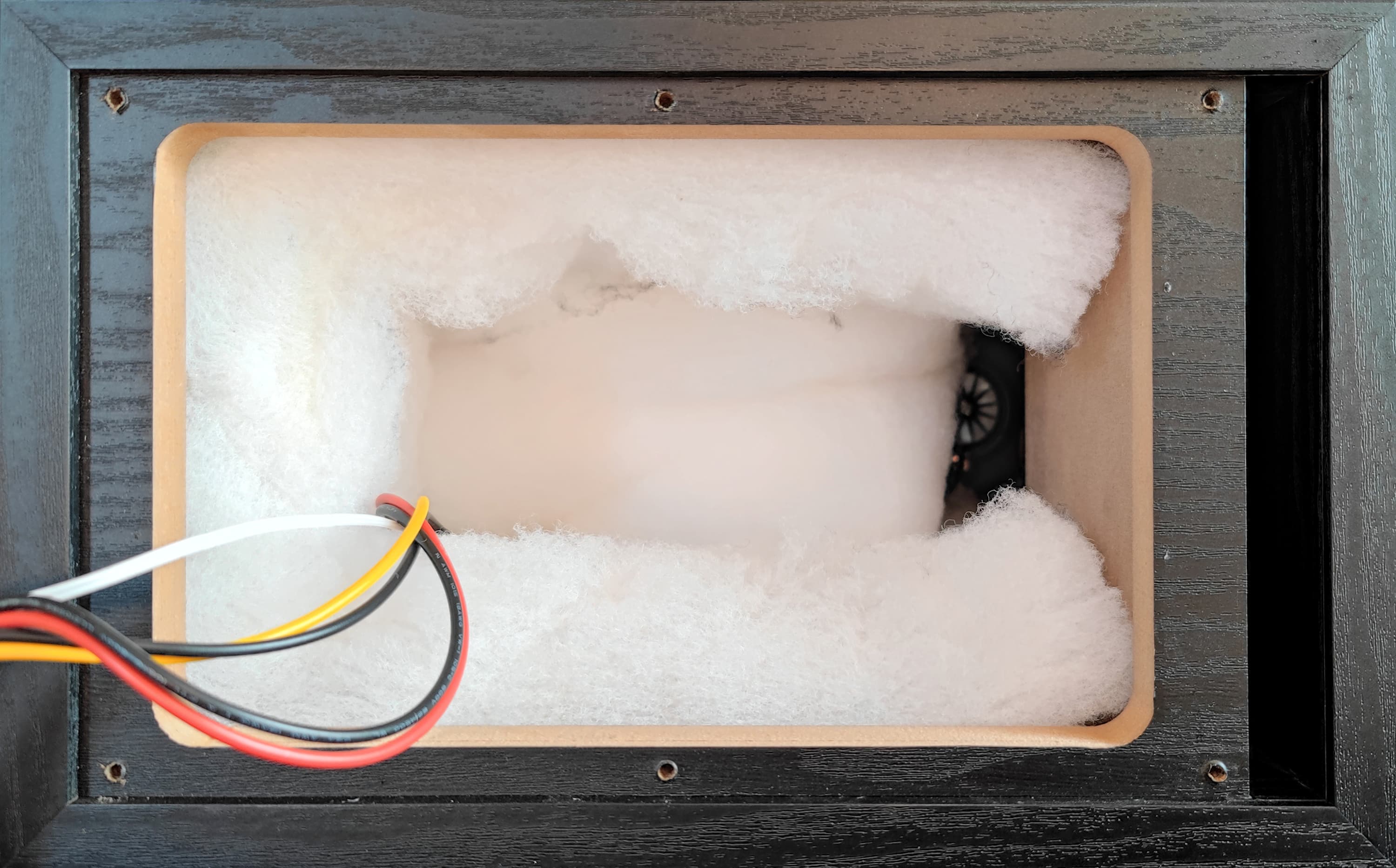 Внутреннее пространство корпуса практически полностью закрыто толстым слоем синтепона, помогающего избавиться от лишних резонансов. Ниже мы увидим, что со своей функцией звукопоглотитель прекрасно справляется.