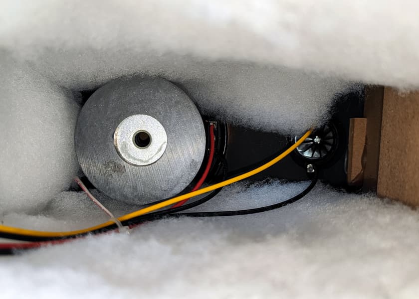 Маркировки на динамиках мы не обнаружили, что немного жаль, конечно. Демпфирующий материал уложен так, чтобы оставить зазор, достаточный для эффективной работы щелевого фазоинвертора.
