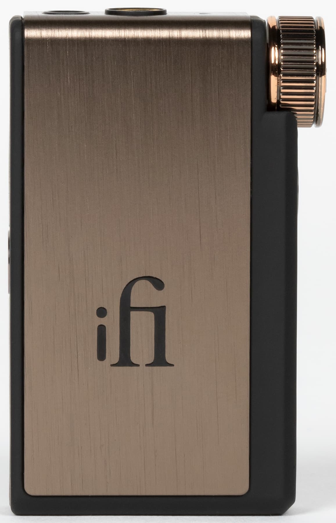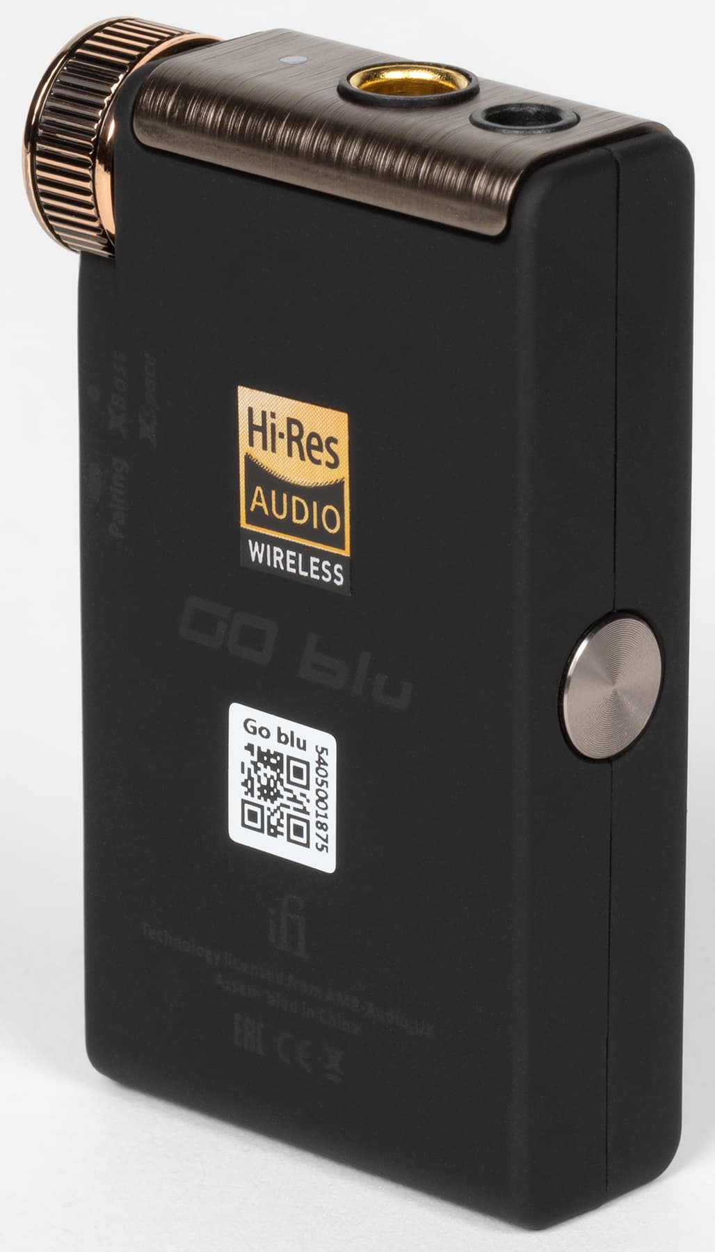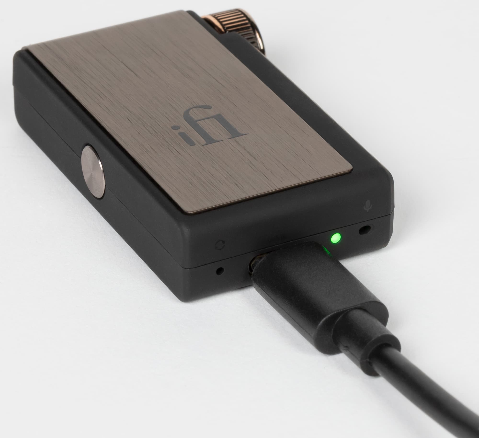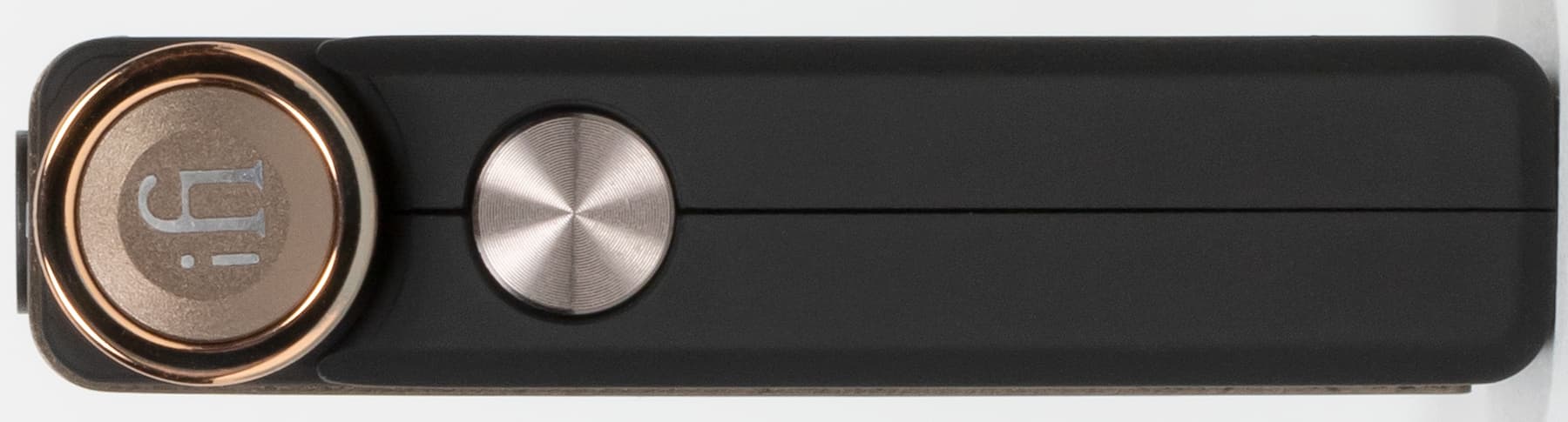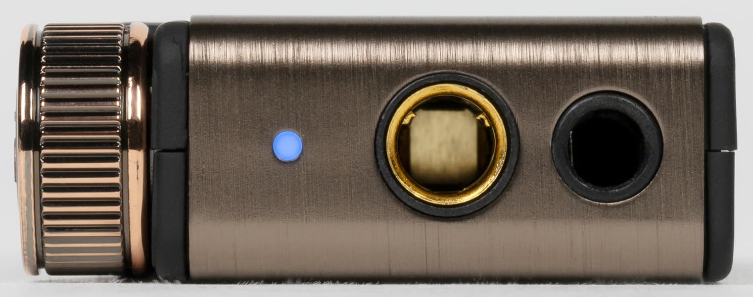 Как уже упоминалось выше, устройство очень компактное: его размеры — всего 55×34×13 мм, а масса — 26 г. Внешний вид и качество сборки не высоте, передняя и верхняя поверхности iFi Go blu закрыты алюминиевой панелью с внешней отделкой под шлифованную бронзу. Остальная часть корпуса выполнена из пластика с софт-тач покрытием, которое крайне приятно на ощупь и обеспечивает возможность надежно удерживать устройство в руках. К появлению следов от прикосновений все поверхности устойчивы.