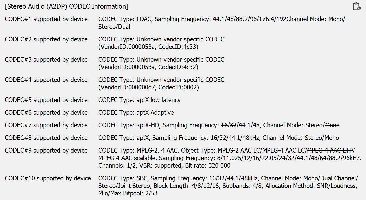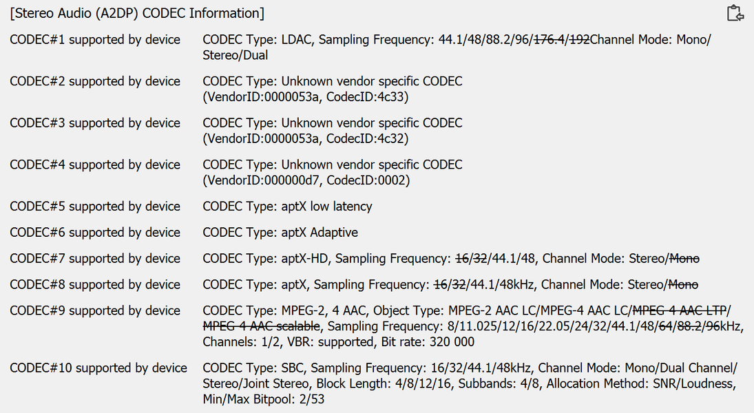 Никаких сюрпризов: AAC, SBC, aptX, aptX HD, aptX Adaptive, aptX LL, LDAC, LHDC/HWA. Некоторые кодеки используемое ПО не смогло «узнать», но их VendorID подсказывают нам, что это именно они. Беспроводное подключение оказалось даже более стабильным, чем мы рассчитывали. При использовании aptX HD и LDAC на улице периодически случаются «заикания» звука, но так редко, что их легко игнорировать. С другими кодеками, включая LHDC/HWA, проблем не было вообще. То же самое можно сказать про «рассинхроны» звука в играх и при просмотре видео — случаются, но не слишком раздражают. В крайнем случае всегда можно перейти на SBC или AAC, уж для игр и видеороликов их возможностей точно хватит.