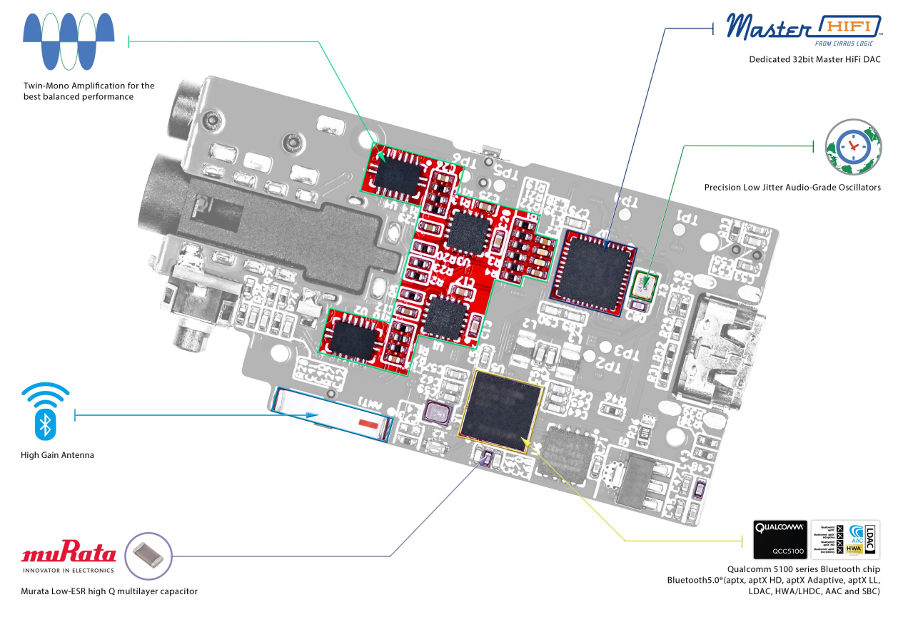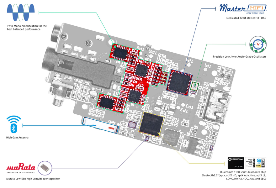 Итак, что же у нас расположено внутри iFi Go blu. За Bluetooth-подключение отвечает сравнительно свежий Qualcomm QCC5100, обеспечивающий поддержку максимума возможных кодеков — от SBC и ACC до aptX HD и LHDC. В качестве ЦАПа выбран Cirrus Logic CS43131, также iFi анонсирует сверхточные осцилляторы, обеспечивающие ультранизкий уровень джиттера.