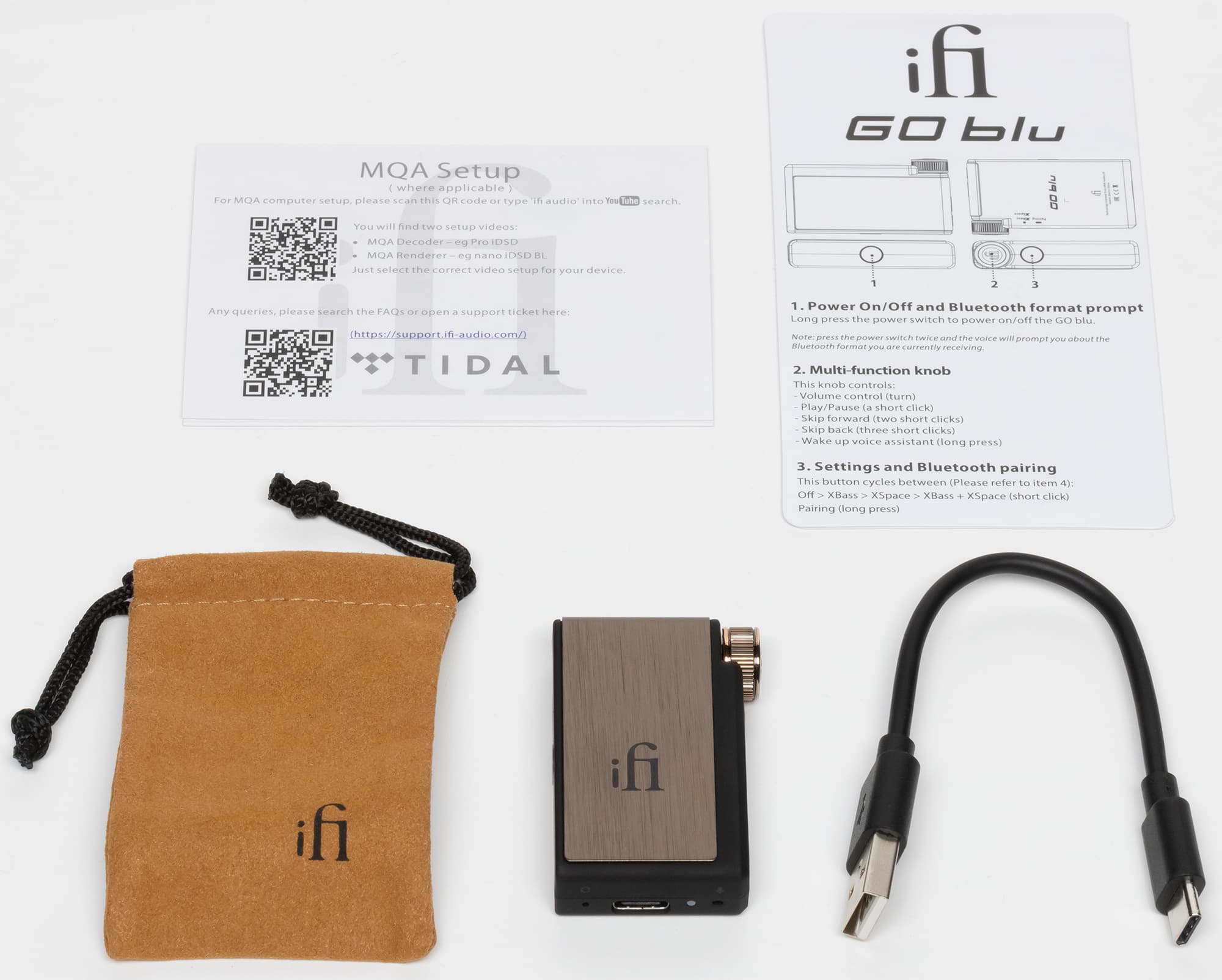 Поставляется iFi Go blu в маленькой белой коробке со съемной крышкой, на «суперобложку» которой нанесено изображение устройства. Внутри сам ЦАП/усилитель дополнительно защищен пластиковым пакетом и удерживается с помощью поролонового ложемента. Аксессуары помещены в отдельную коробку.