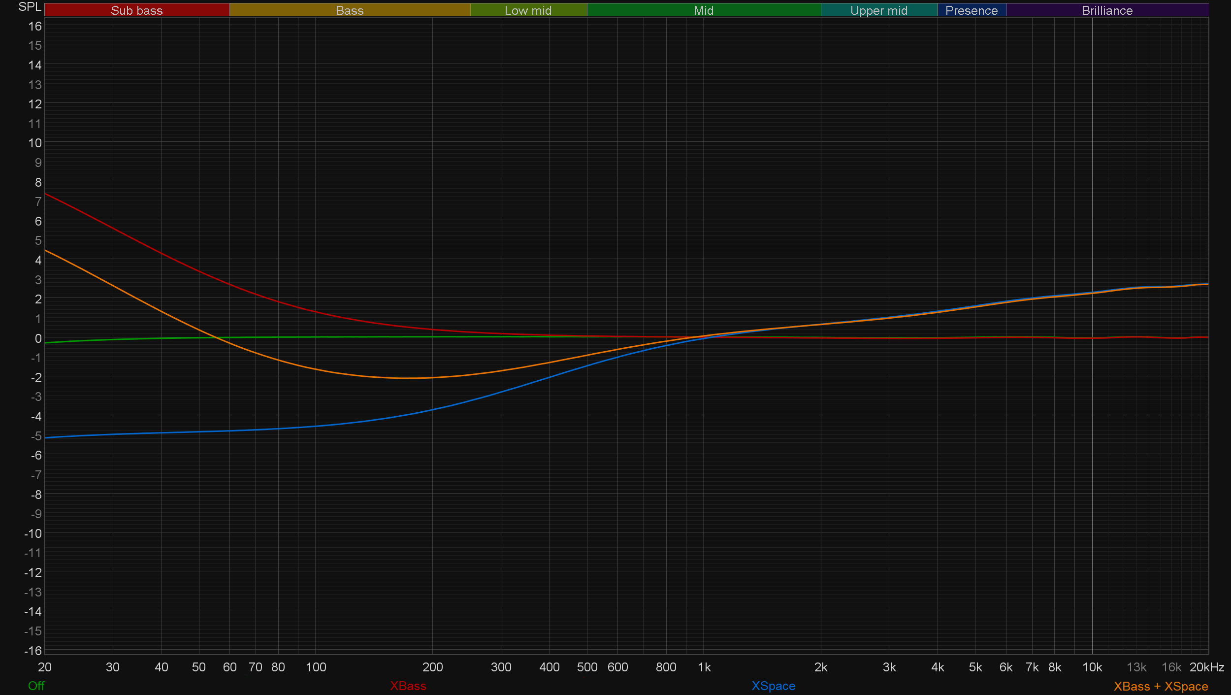 Говоря же про XSpace, мы изначально предполагали, что обещанный «вынос звука за пределы головы» осуществляется за счет добавления неких эффектов реверберации. Но оказалось, что на АЧХ включение функции влияет, да еще как — НЧ-диапазон заметно уводится назад, а на высоких частотах появляется небольшой акцент. При этом совместное включение режимов позволяет немного вернуть бас на место и даже сделать небольшой акцент на самой «глубокой» его части.
