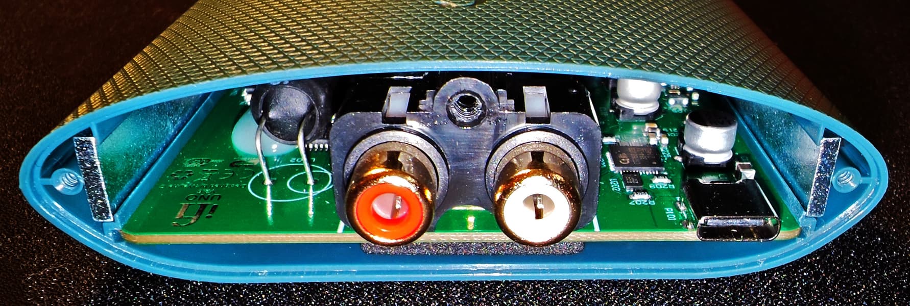 Задняя панель устройства удерживается тремя винтами и без проблем демонтируется, давая доступ к плате. А вот дальше все становится неожиданно сложнее, плата удерживается внешней частью ручки громкости, демонтировать которую оказалось не так-то просто — требуемое усилие заставляет сомневаться в том, что удастся не повредить конструкцию. Пришлось отказаться от этой затеи.