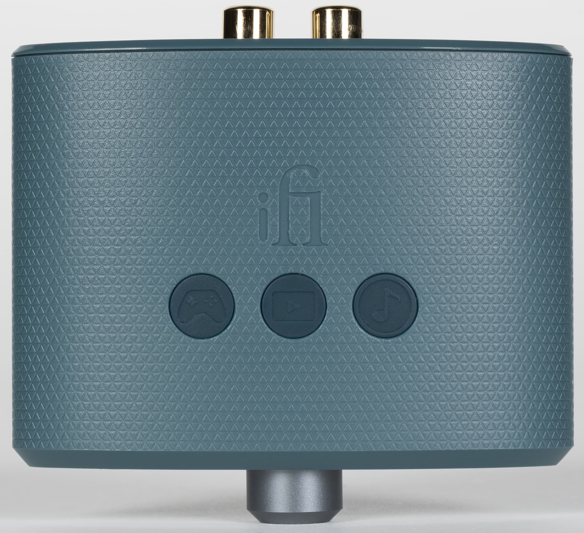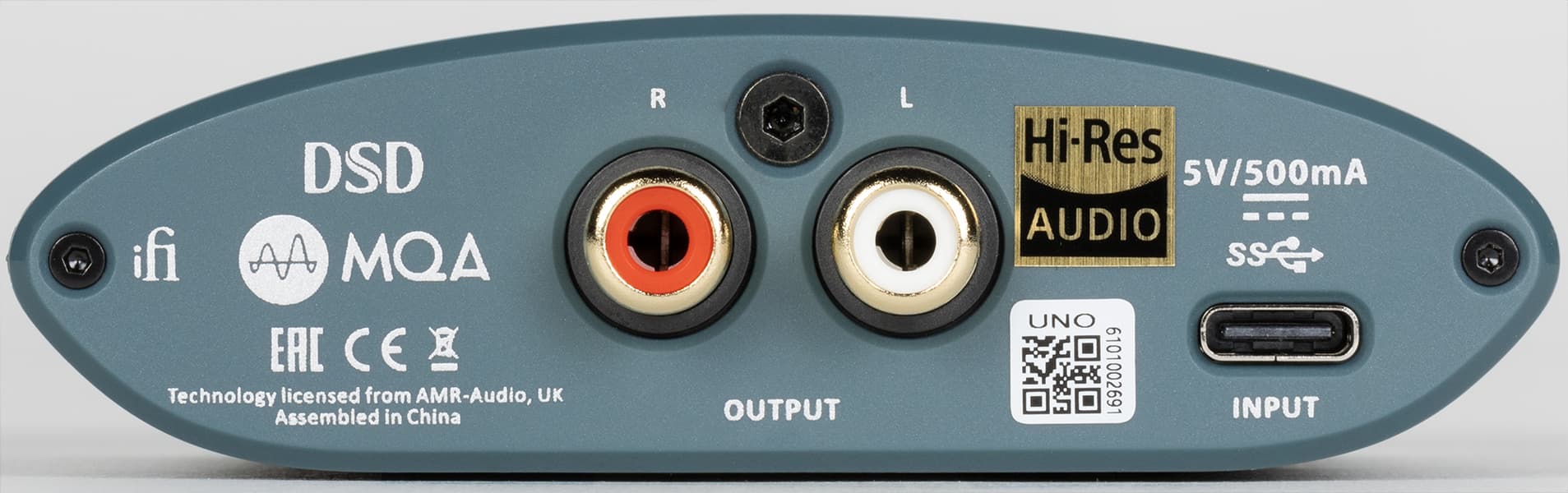 Форма корпуса у всей линейки очень узнаваемая, а вот материал разный — в более дорогих моделях используется металл, в бюджетных — пластик. У iFi Uno сам корпус, естественно, пластиковый, а вот передняя и задняя стенка сделаны из алюминия. Окраску производитель называет Air Force Blue — по всей видимости, речь идет о фирменном серо-голубом цвете британских военно-воздушных сил. Спереди и сзади размещены панели для подключения и управления устройством, их наполнение мы подробно разберем в соответствующих главах обзора.