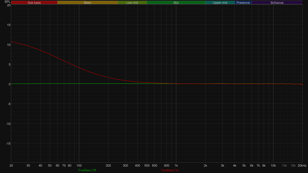Как легко заметить, включение функции действительно приводит к появлению довольно значительного акцента на низкочастотном диапазоне, при этом чем ниже частота — тем основательнее она подчеркивается. Бас при этом остается на удивление собранным — без «бубнения». Бассехдам понравится точно, нам в IEM и закрытых наушниках акцент на НЧ-диапазоне показался чуть излишним, а вот в традиционно не самых басовитых открытых он воспринимается очень хорошо.
