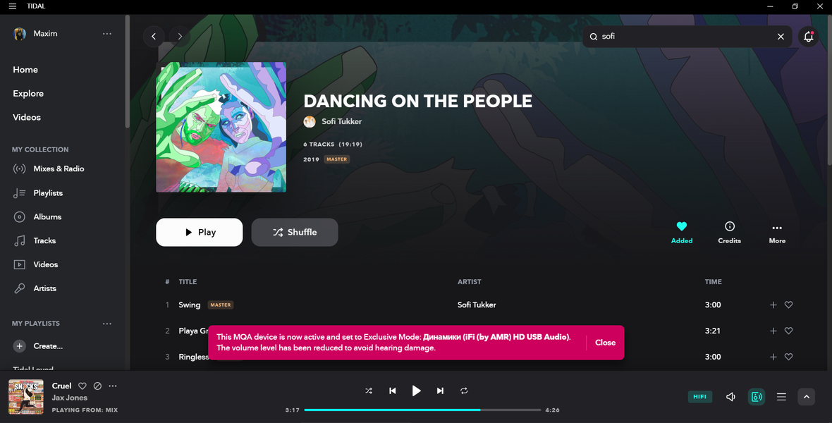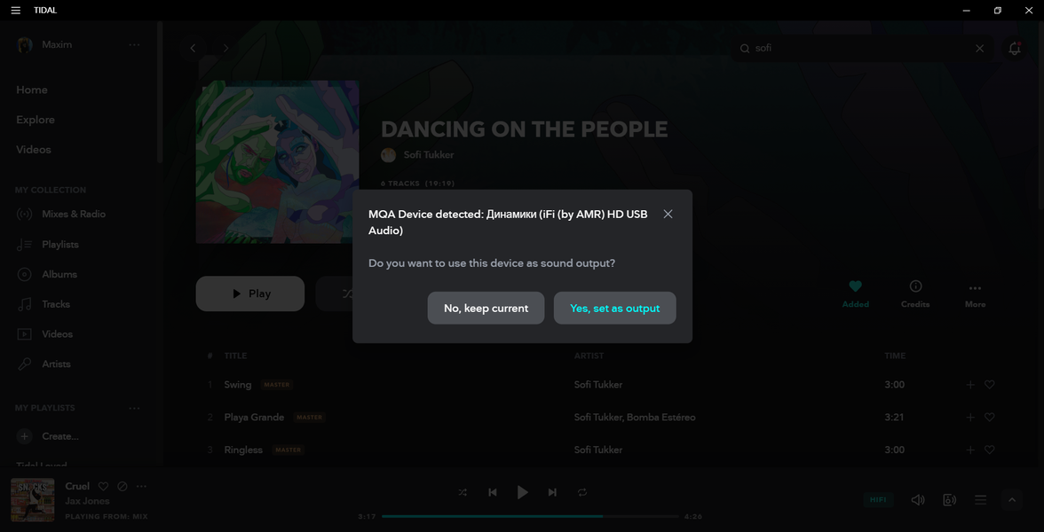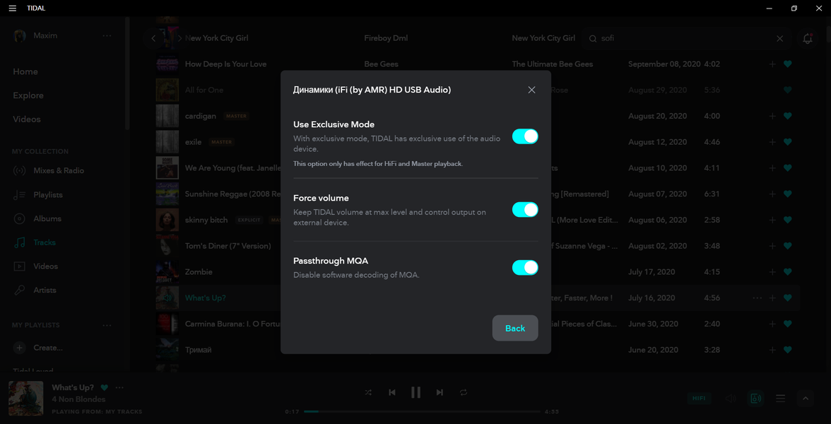 Одной из самых интересных его особенностей является поддержка MQA. А главный источник потоков в этом формате — конечно, Tidal. Который в России пока официально не работает, но у всех заинтересованных пользователей аккаунт там есть, и давно. Windows-клиент сервиса сразу обнаруживает ЦАП/усилитель и предлагает его использовать. Достаточно просто согласиться, после чего он автоматически выбирается как устройство воспроизведения с эксклюзивным доступом.