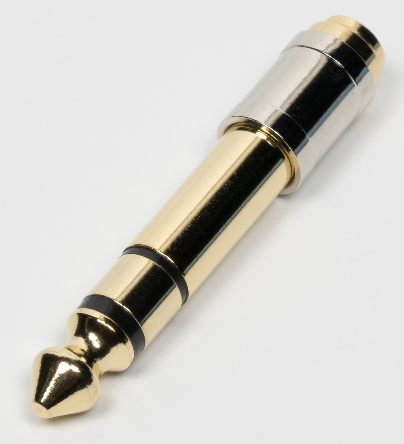 Переходник с миниджека 3,5 мм на «большой джек» 6,3 мм компактный, но с функцией своей справляется отлично — все контакты получаются надежными и плотными.