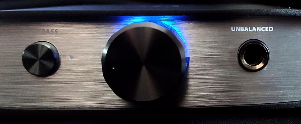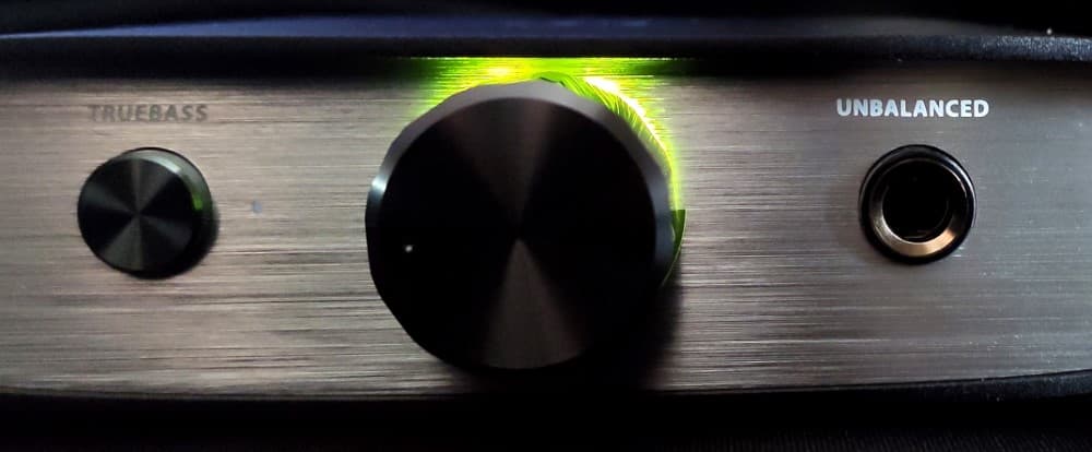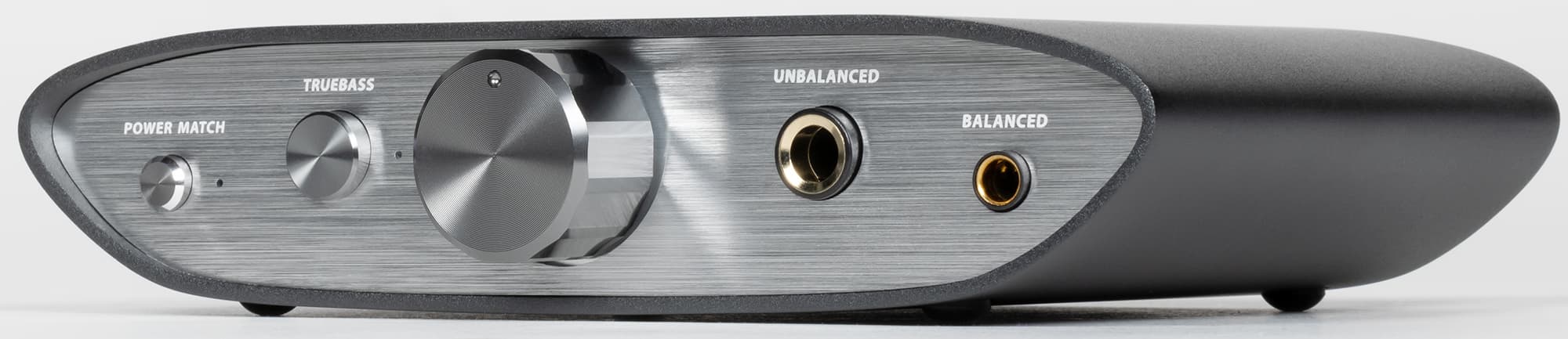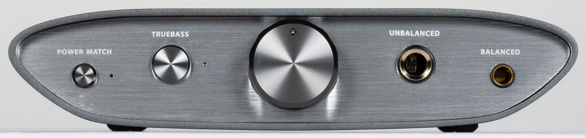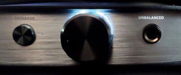 Далее у нас идет кнопка True Bass, активирующая функцию усиления баса. По заявлению производителя, она позволяет сделать слышимый акцент на низких частотах, но при этом не искажает средние — об этом мы еще непременно поговорим ниже. Здесь же заметим, что в режиме фиксированной громкости при передаче сигнала на линейный выход True Bass недоступен, если переключить на регулируемую — все работает. Ну и, наконец, в правой части лицевой панели расположились два разъема для наушников: джек 6,3 мм и балансный 4,4 мм Pentaconn.