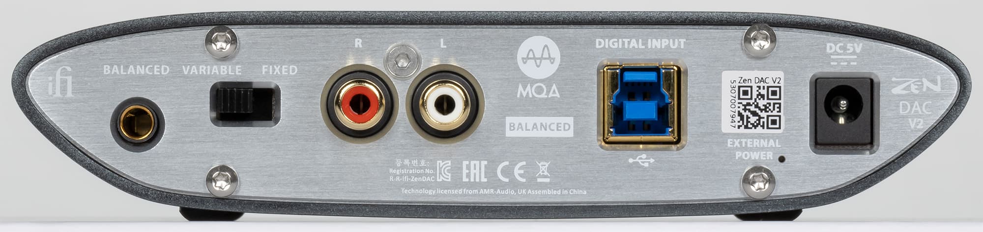 Разговор о подключении начнем с задней панели. Главное тут — конечно, вход USB-B 3.0, с помощью которого мы будем подключать iFi Zen DAC к ПК. Там же находятся линейные выходы — 2×RCA и балансный 4,4 мм Pentaconn, которые можно использовать для подключения iFi Zen DAC к активной акустике или внешнему усилителю. Между выходами находится переключатель, позволяющий выбрать один из режимов их работы — регулируемый или фиксированный, в котором сигнал идет в обход регулятора громкости. Соответственно, уровень громкости можно регулировать как на самом iFi Zen DAC, так и на подключенном усилителе — как удобнее.