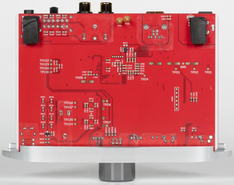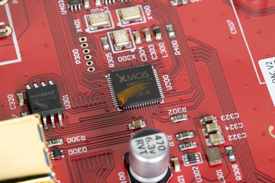 Практически по центру расположилась чуть ли не главная «обновка» второй версии iFi Zen DAC — 16-ядерный микроконтроллер XMOS, пришедший на смену 8-ядерному «коллеге». Увеличение вычислительной мощности, в частности, позволило обеспечивать полное декодирование формата MQA прямо на борту, тогда как базовая модель могла выступать только в качестве рендерера — декодирование выполнял подключенный к ней компьютер. Левее видна флеш-память Winbond Electronics 25Q32FVSIG.