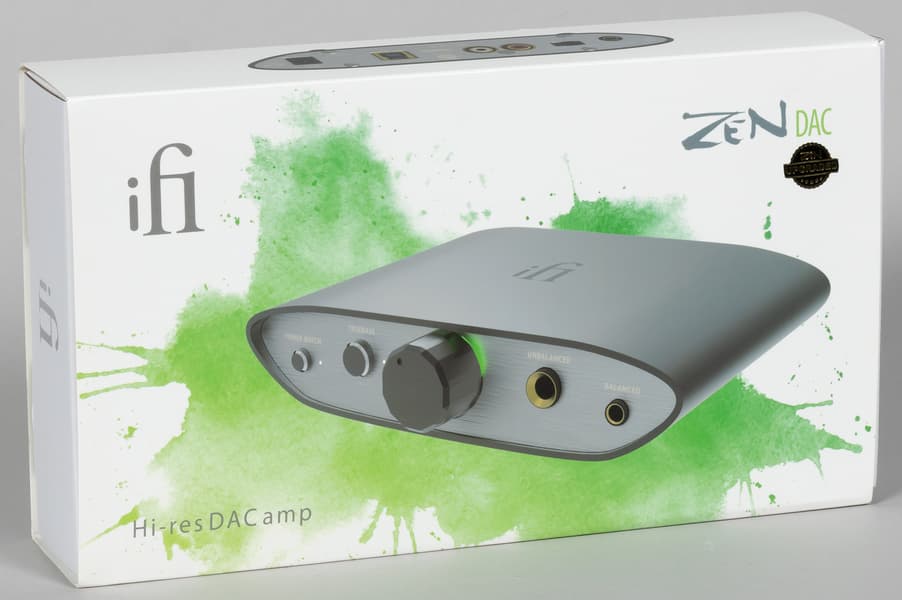 Поставляется iFi Zen DAC в белой коробке с изображением устройства на фоне яркой зеленой «кляксы» — выглядит оригинально, да и на позитивный лад как-то сразу настраивает. От упаковки прошлой версии ее отличает только черно-золотая наклейка с надписью «upgraded».