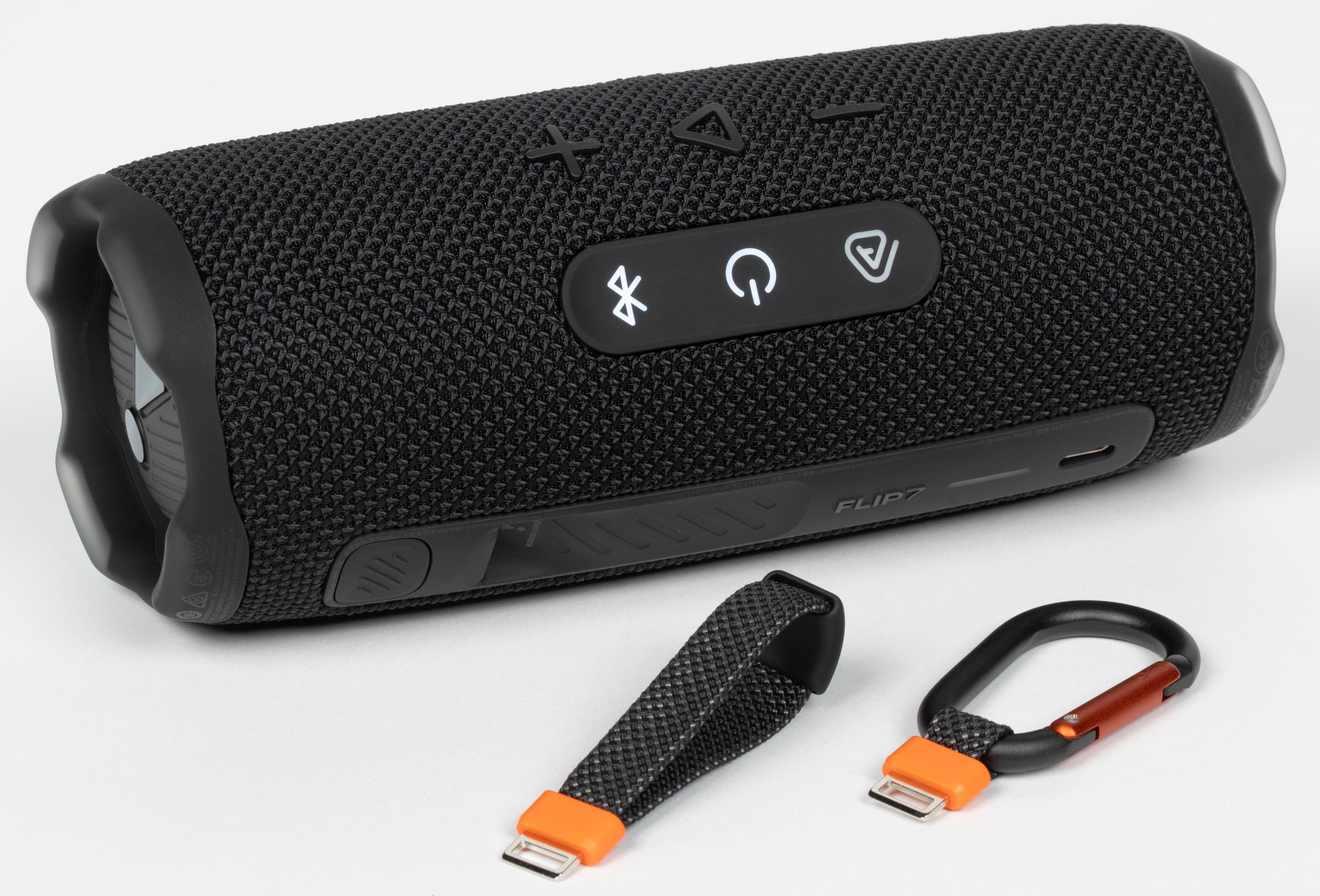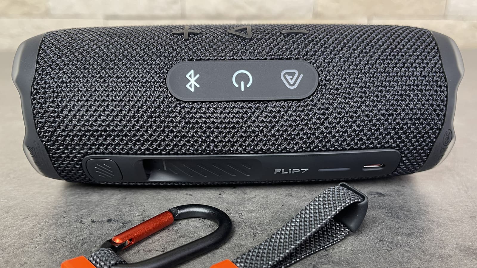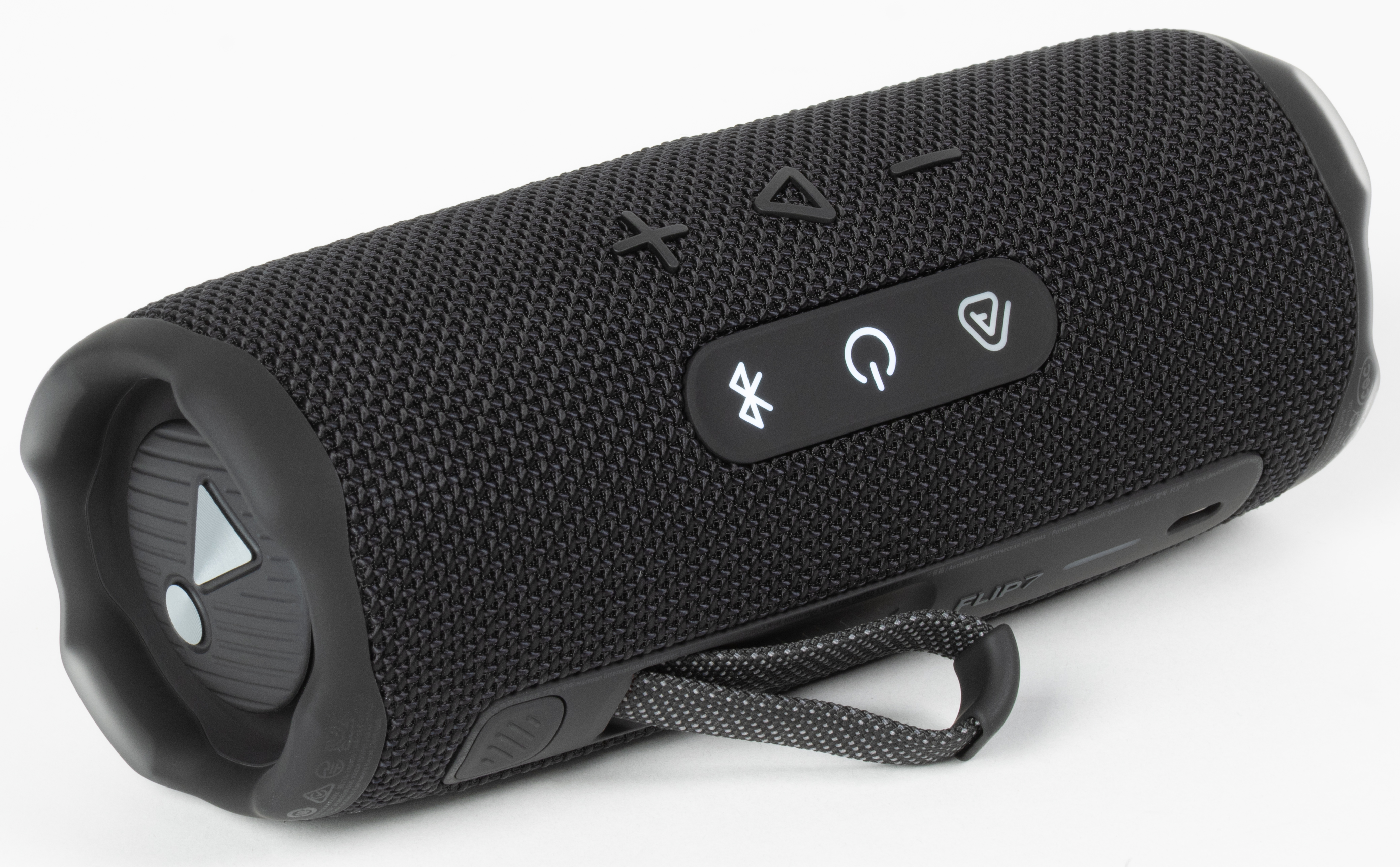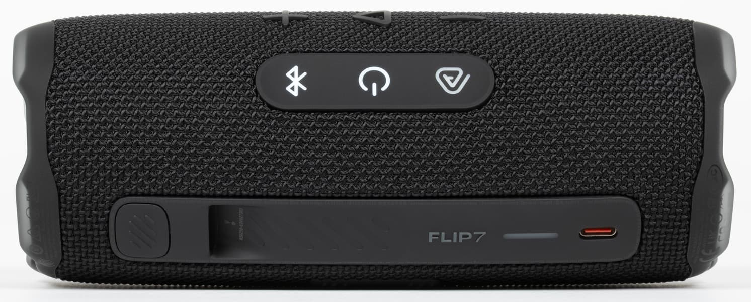 Кнопки управления воспроизведением и громкостью, как и раньше, сделаны рельефными — ими удобно пользоваться на ощупь. В предыдущей модели Flip 6 рядом с ними находилась кнопка активации режима PartyBoost, которую легко было перепутать с клавишей воспроизведения. В Flip 7 клавишу Auracast перенесли на отдельную панель, благодаря чему пользоваться управлением стало заметно удобнее. Сами кнопки нажимаются с комфортным усилием и мягким, но четким кликом.
