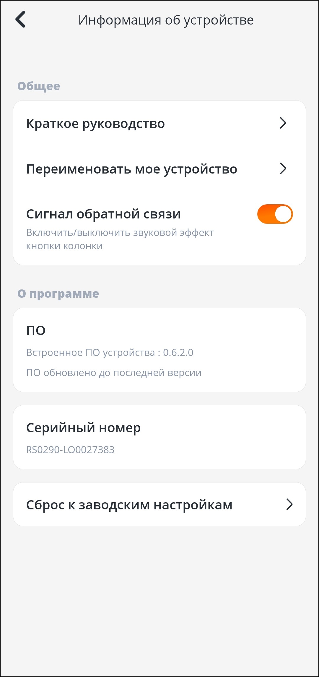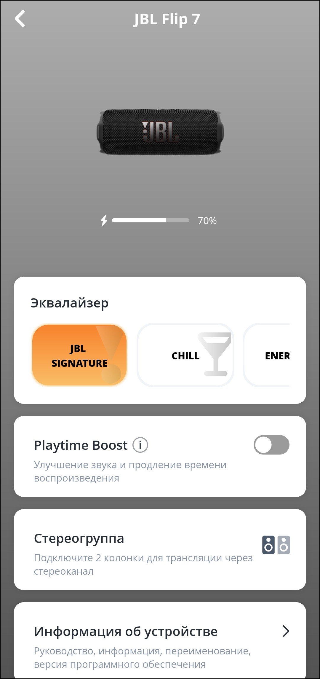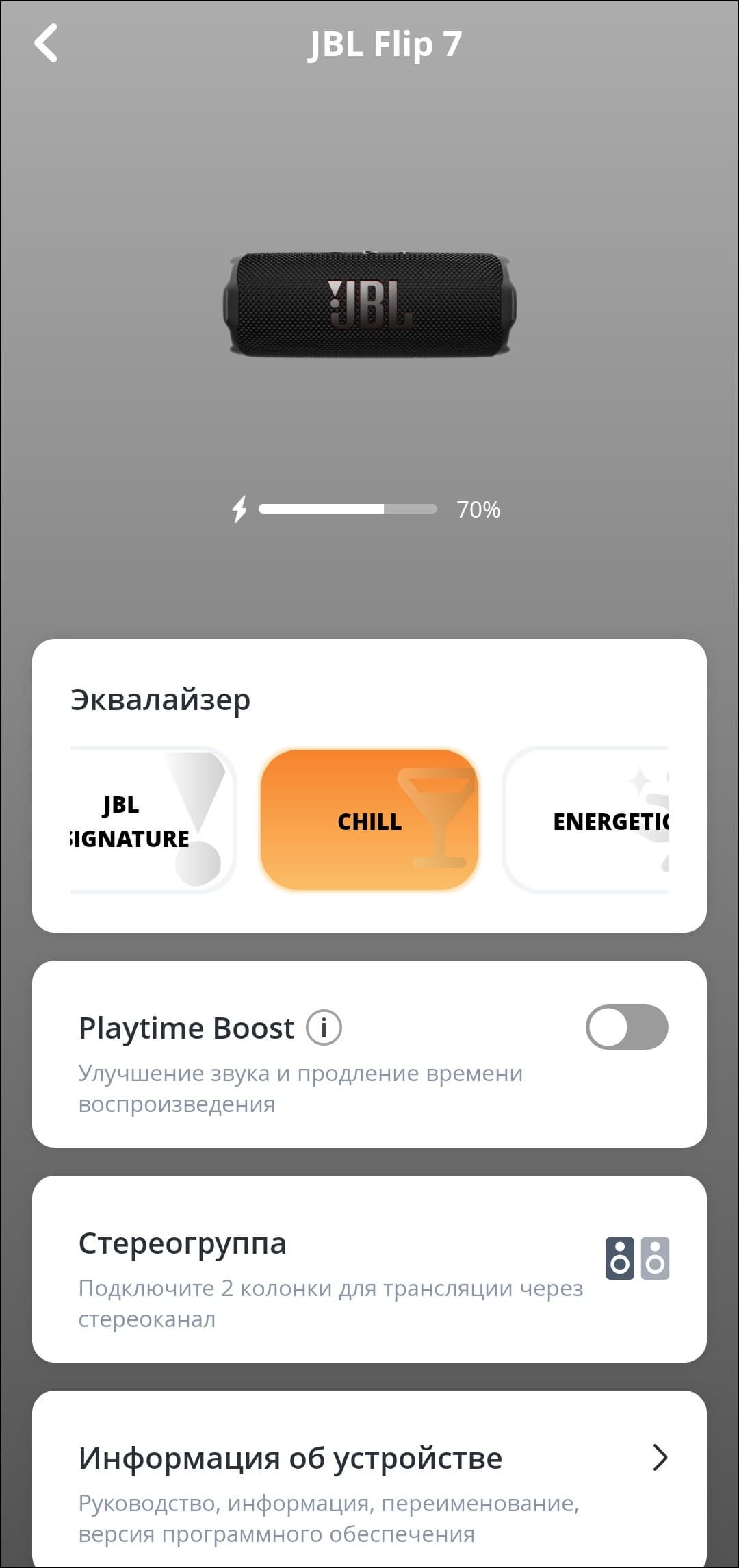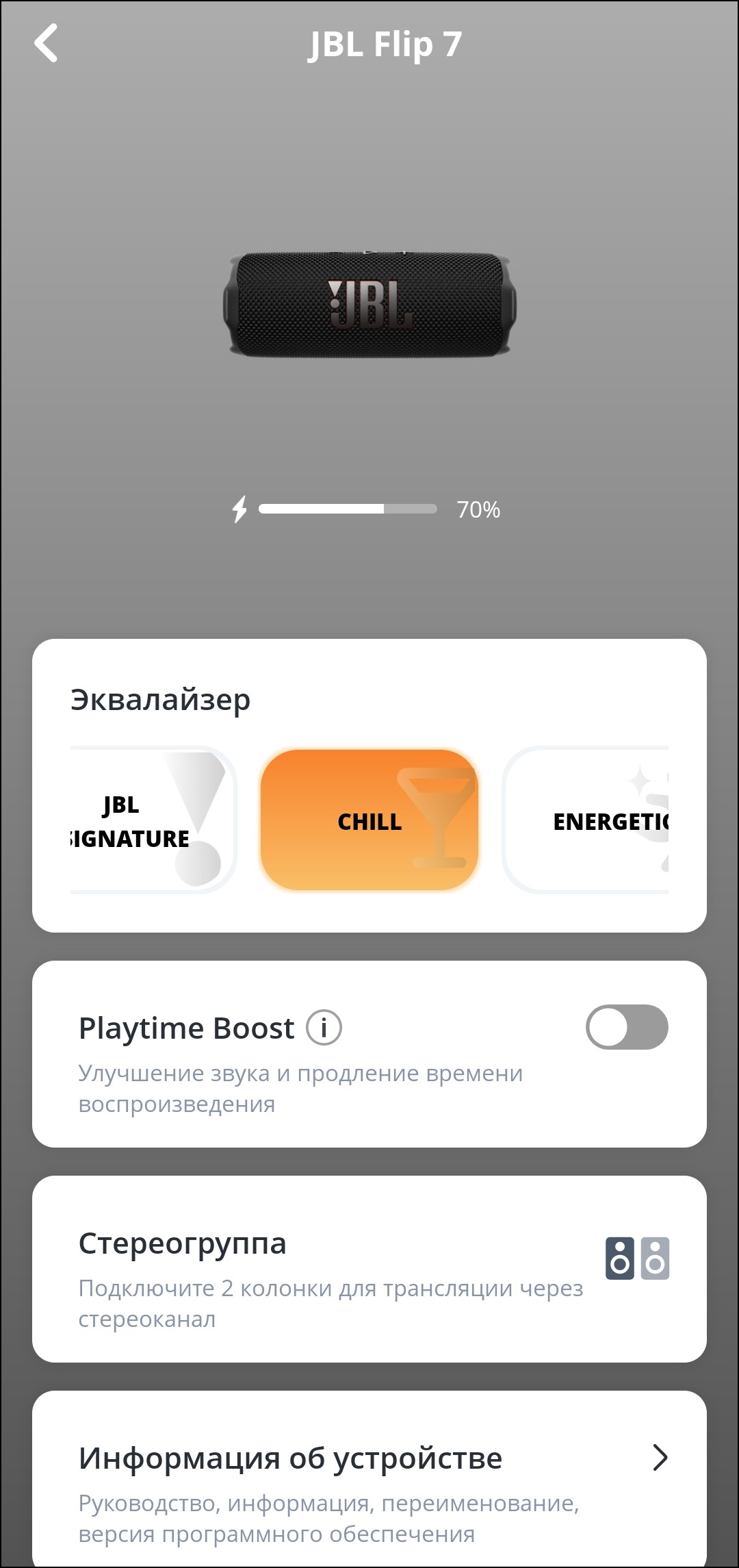 Далее мы видим модуль активации функции PlayTime Boost — разработчики JBL как-то особенно любят слово «boost» и используют его при любом удобном случае. Как можно догадаться из названия, опция продлевает время работы колонки — далее мы увидим, что делается это за счет заметного снижения уровня низких частот. Следующая кнопка отвечает за запуск создания стереопары, ну а на странице информации об устройстве можно найти не только непосредственно информацию, но и возможность переименовать колонку, отключить сигналы о событиях, а также почитать инструкцию на английском языке.