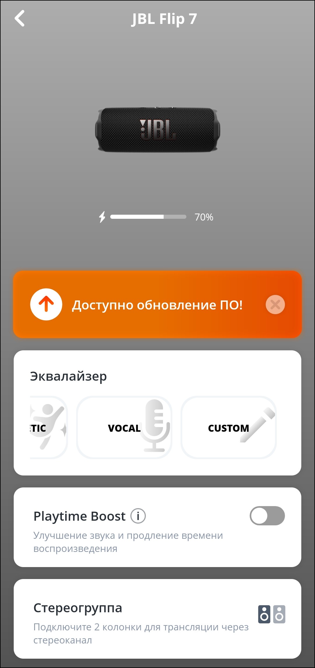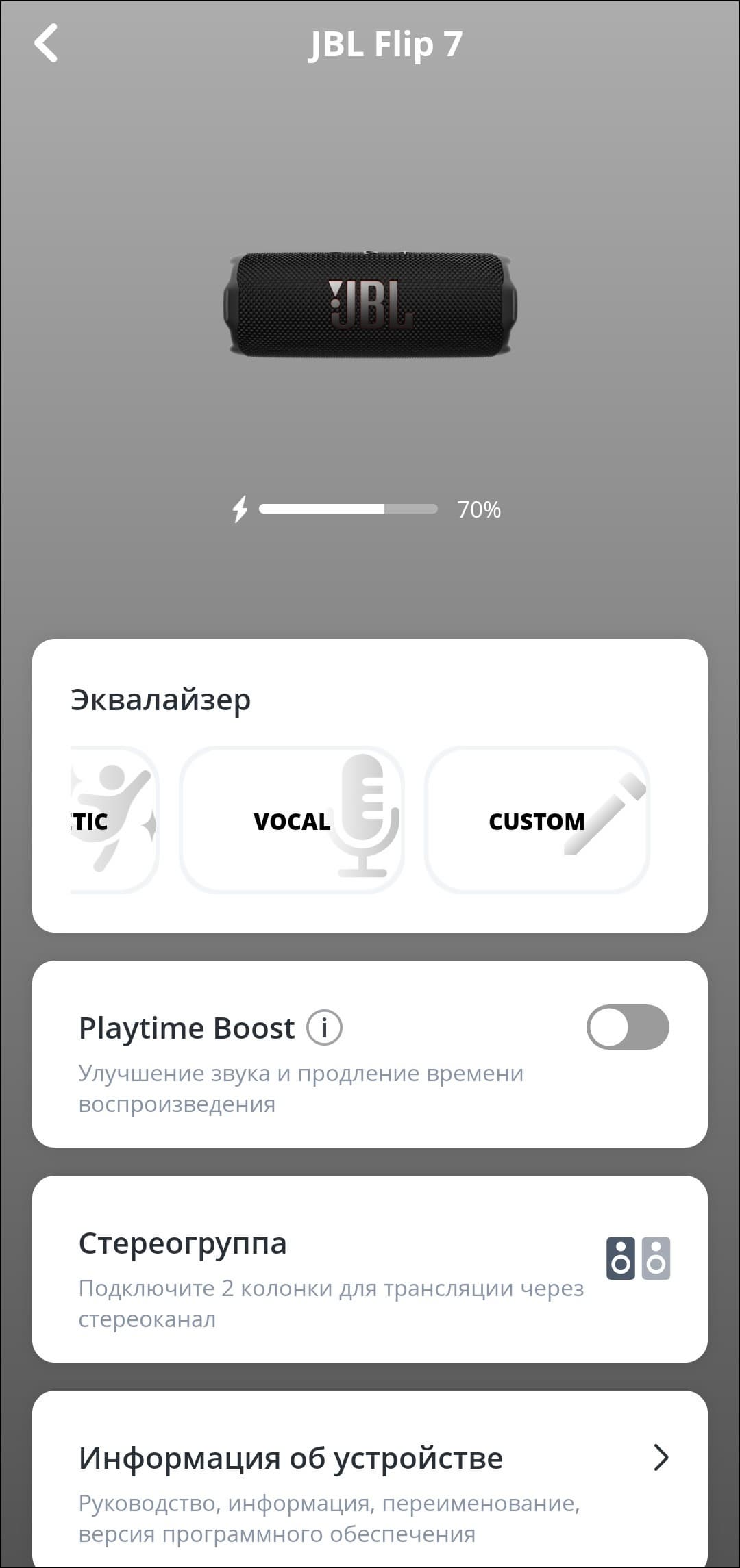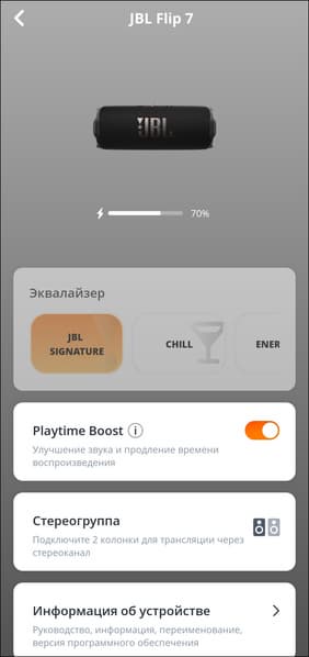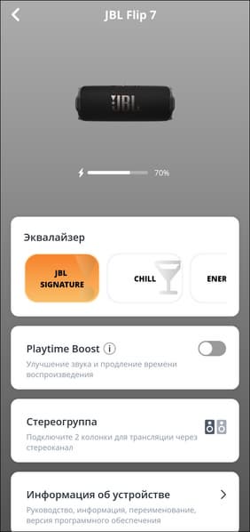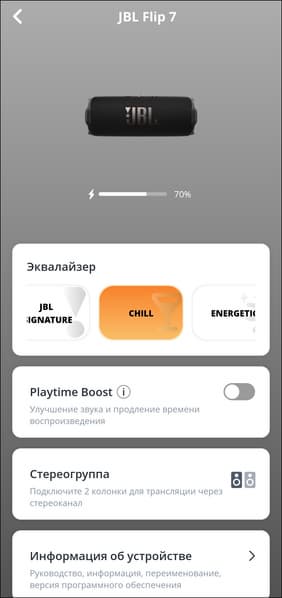 В верхней части экрана устройства в приложении размещено его изображение, чуть ниже — небольшой индикатор уровня зарядки. А вот дальше начинается самое интересное — настройки эквалайзера. По умолчанию предлагается пять пресетов, плюс есть возможность создавать свои. Причем не с помощью простенького 3-полосного эквалайзера, как это было у Flip 6, а с помощью 7-полосного. Это еще не полноценный параметрический эквалайзер, как у Soundcore Boom 3i, но уже большой шаг вперед — возможности корректировки звука под личные предпочтения сильно расширились.