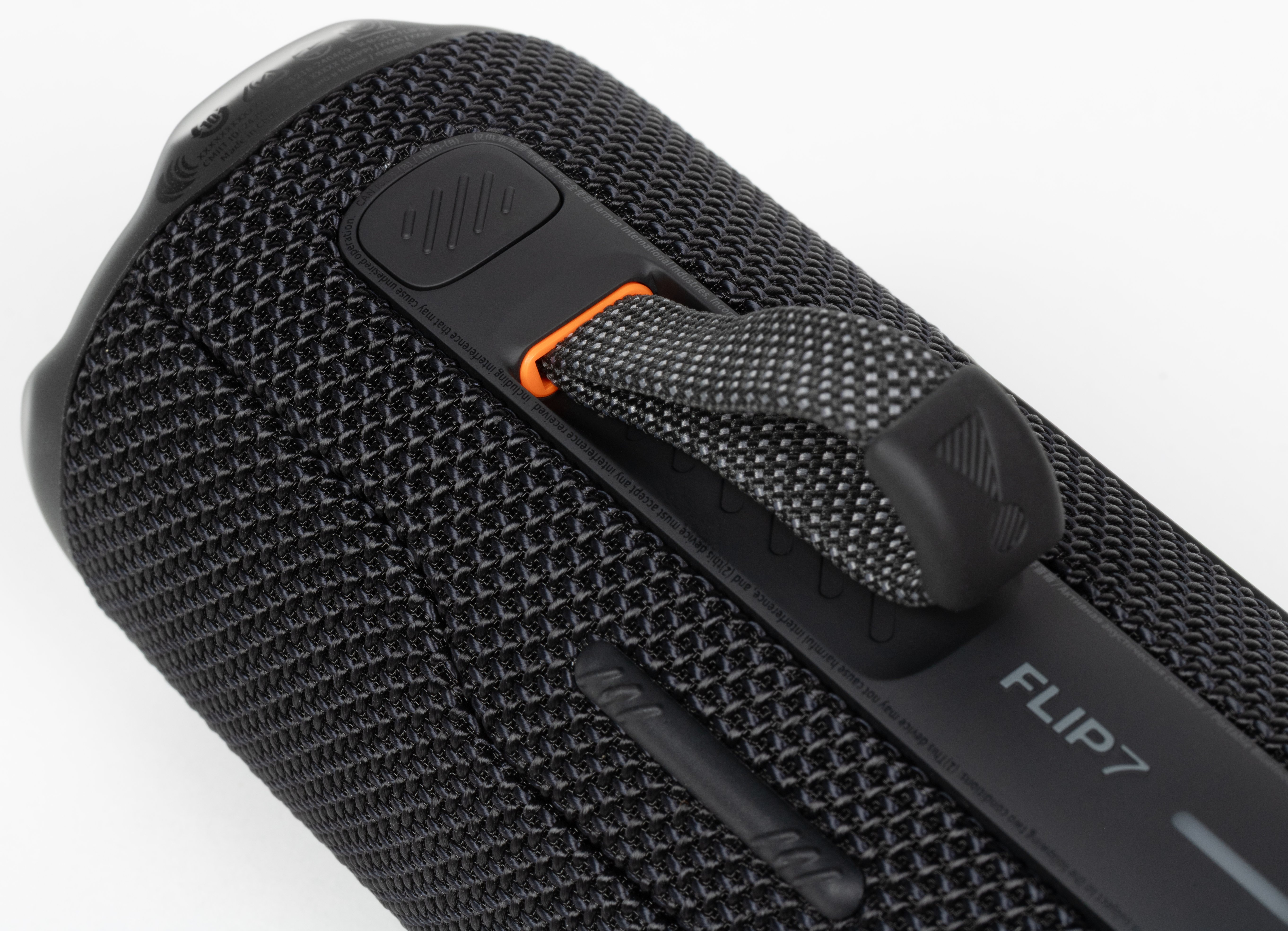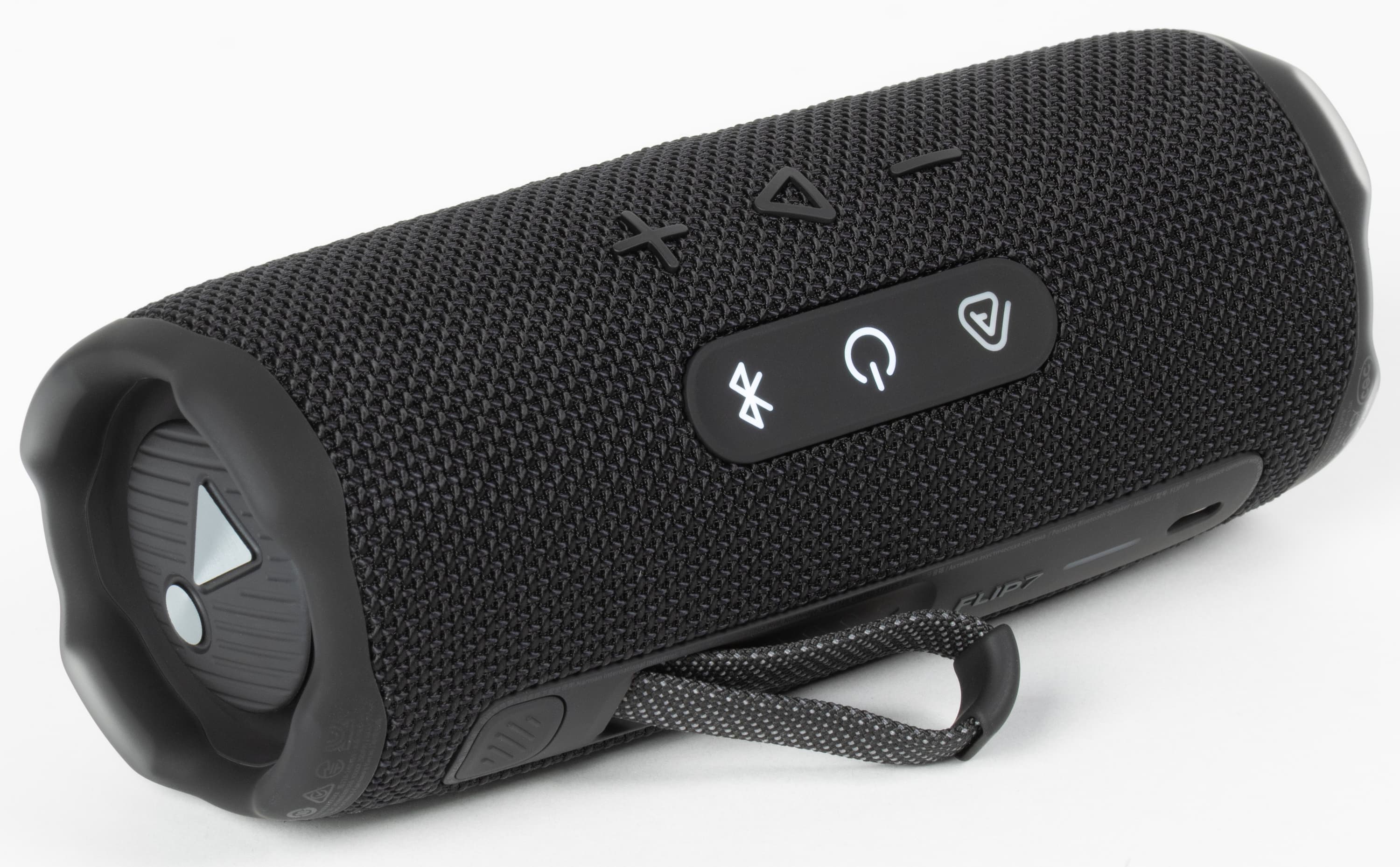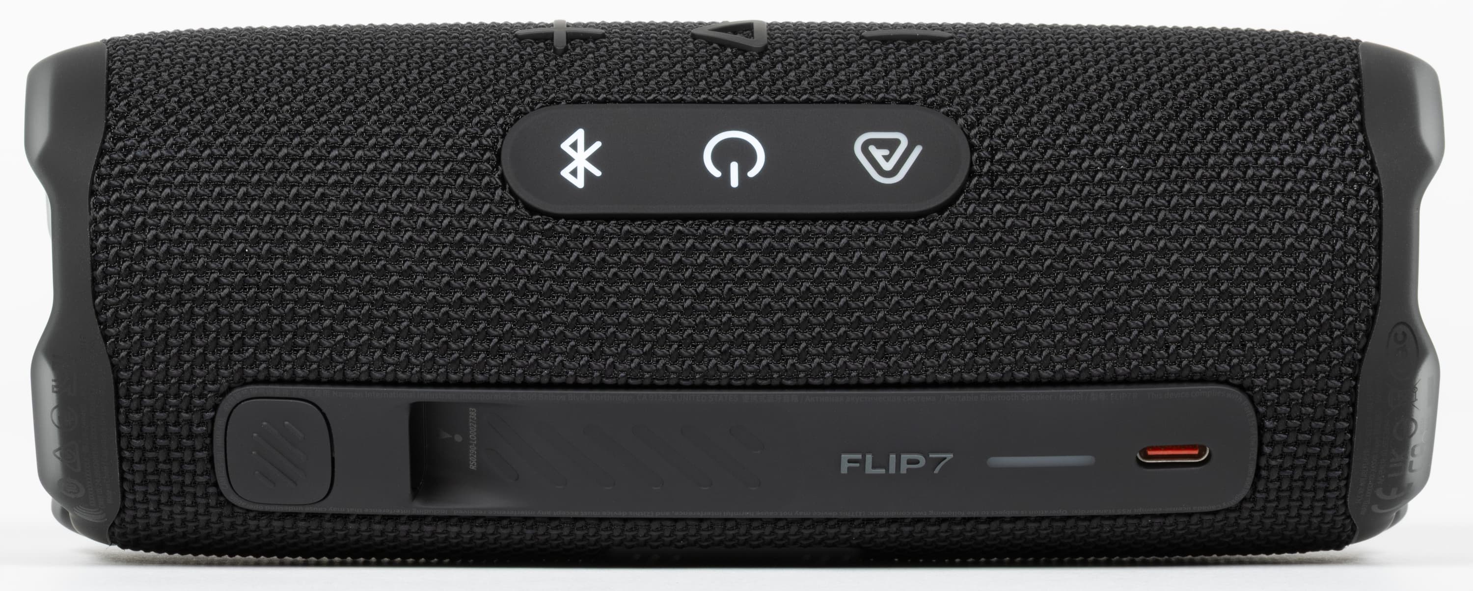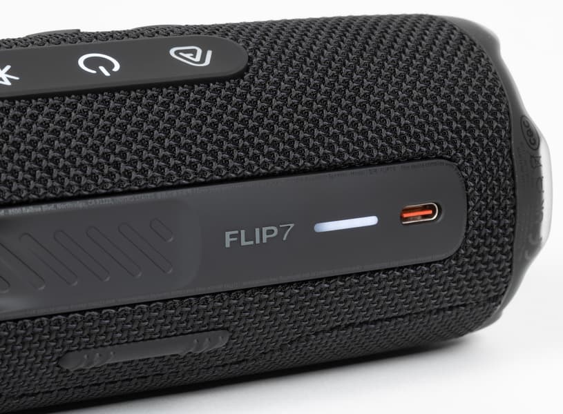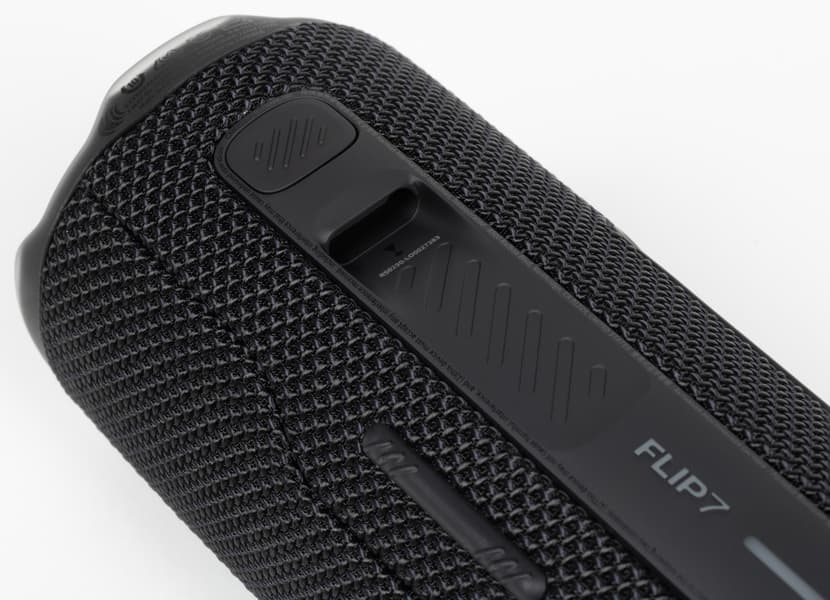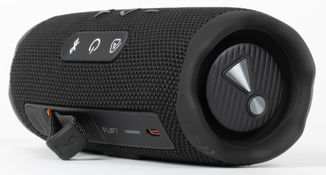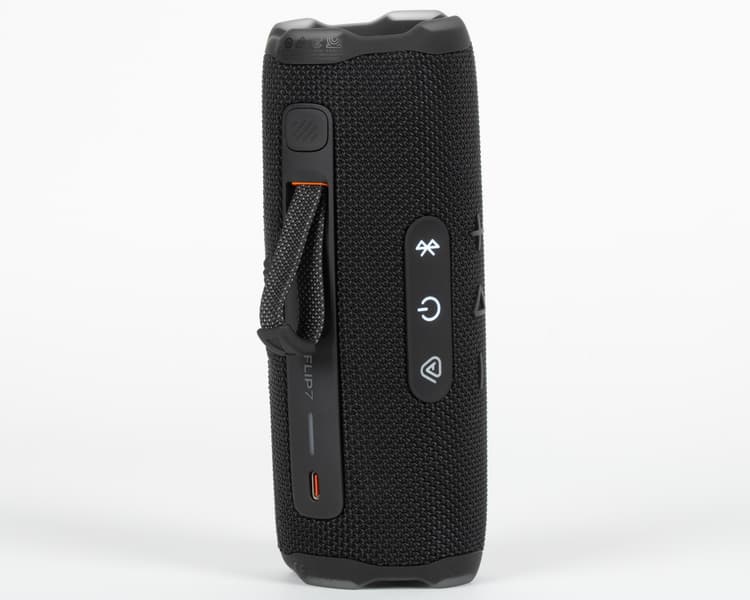 В прошлых версиях JBL Flip кнопки были разделены на две секции и располагались на разных сторонах корпуса, из-за чего пользователю приходилось постоянно вертеть колонку в руках. Во Flip 7 разделение на зоны сохранилось, но теперь они находятся рядом и оказываются под рукой при горизонтальном размещении устройства.