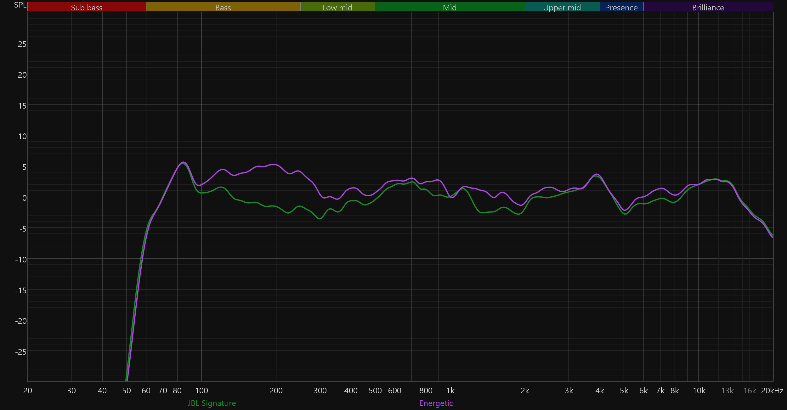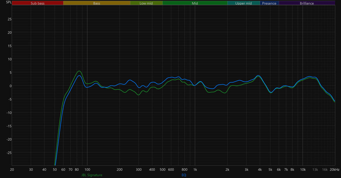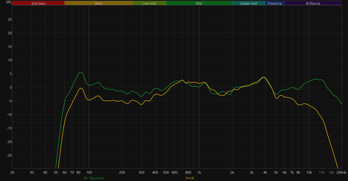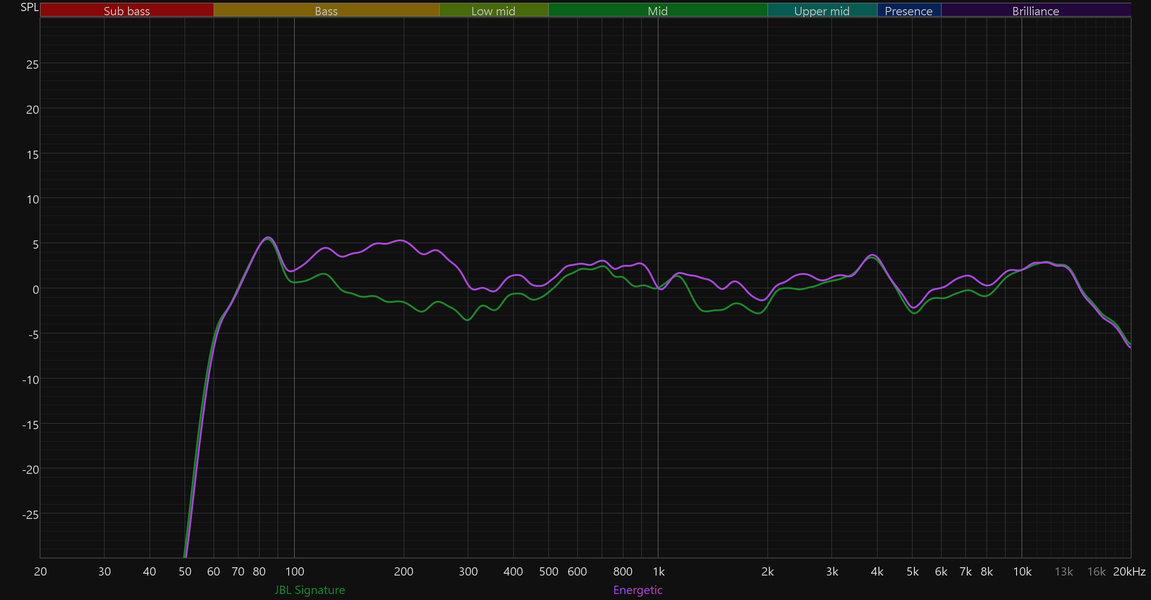 Приведенные выше графики АЧХ получены в режиме JBL Signature, активируемом по умолчанию. Остальные пресеты ведут себя ровно так, как и ожидаешь, судя по их названиям. Chill смягчает подачу, слегка уводя назад верхние частоты; Energetic эффектно подчеркивает бас и нижнюю середину; а Vocal делает акцент на средних, приглушая края диапазона. Смена типа подключения ни коим образом не отражается на графике, потому приводим только те, что получены при беспроводном.