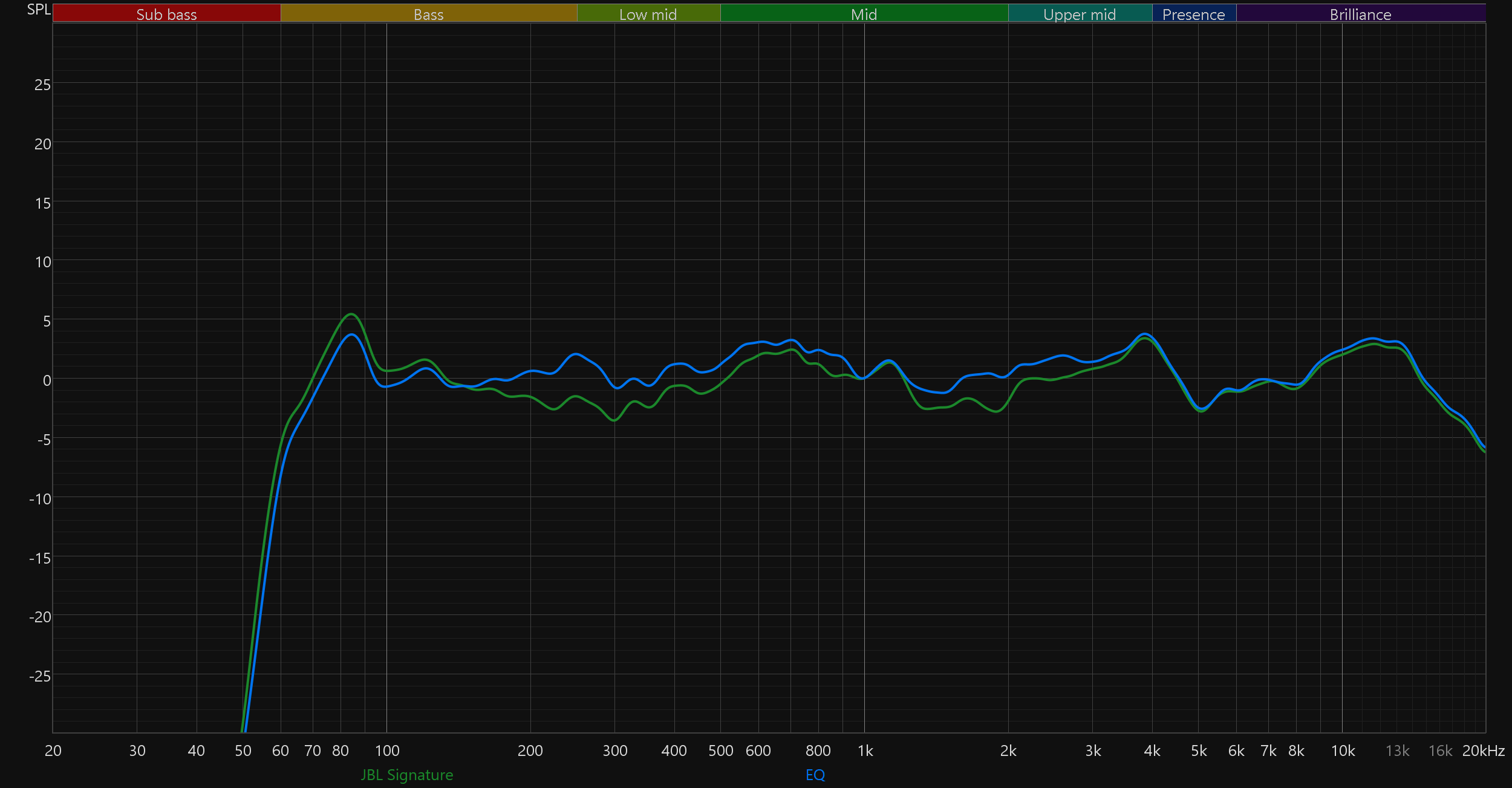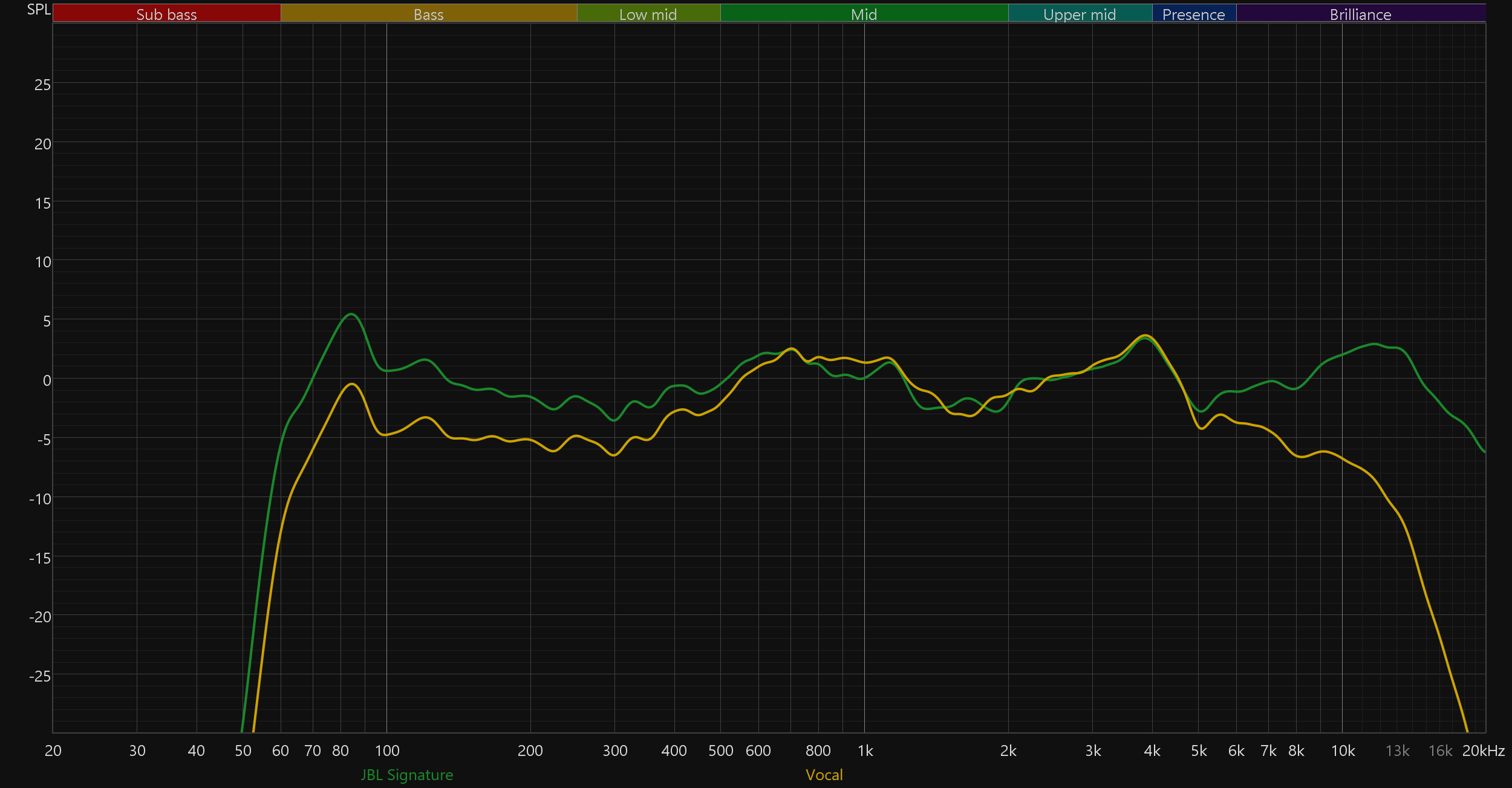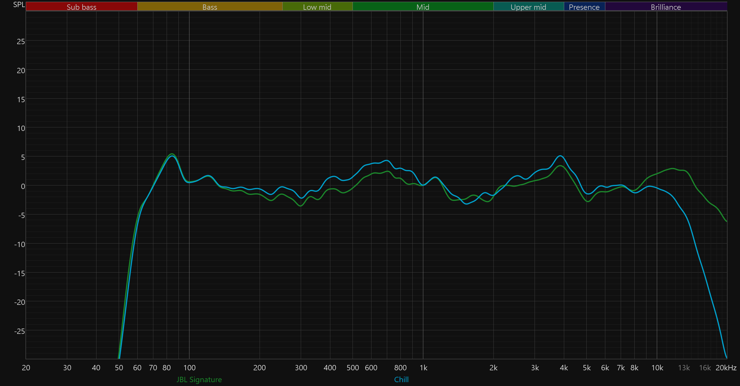 Приведенные выше графики АЧХ получены в режиме JBL Signature, активируемом по умолчанию. Остальные пресеты ведут себя ровно так, как и ожидаешь, судя по их названиям. Chill смягчает подачу, слегка уводя назад верхние частоты; Energetic эффектно подчеркивает бас и нижнюю середину; а Vocal делает акцент на средних, приглушая края диапазона. Смена типа подключения ни коим образом не отражается на графике, потому приводим только те, что получены при беспроводном.