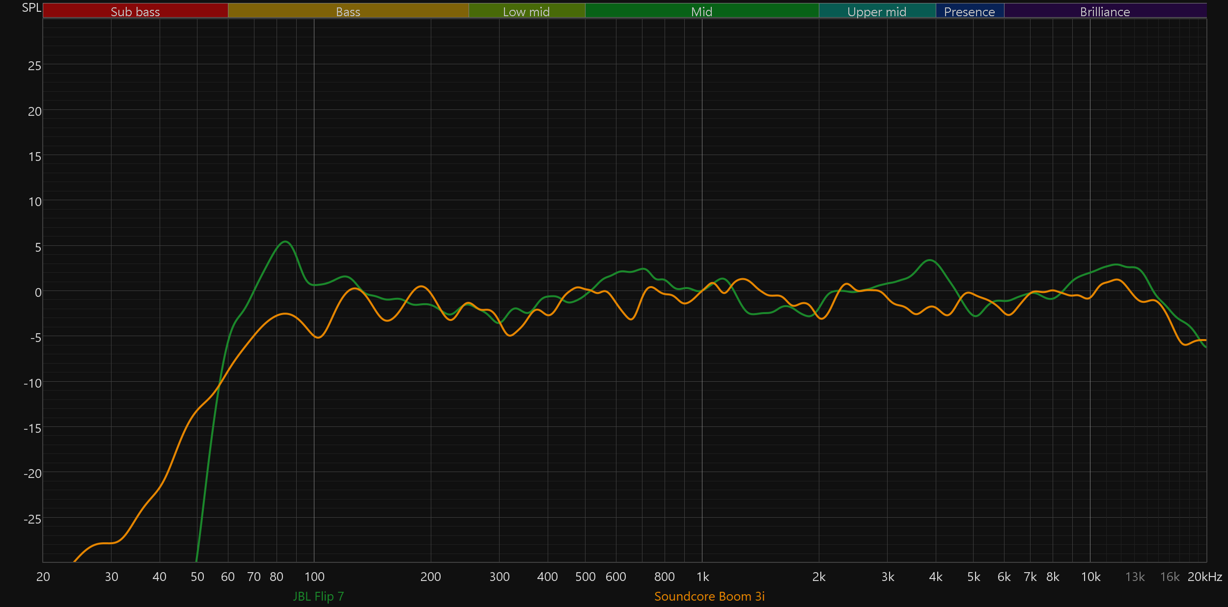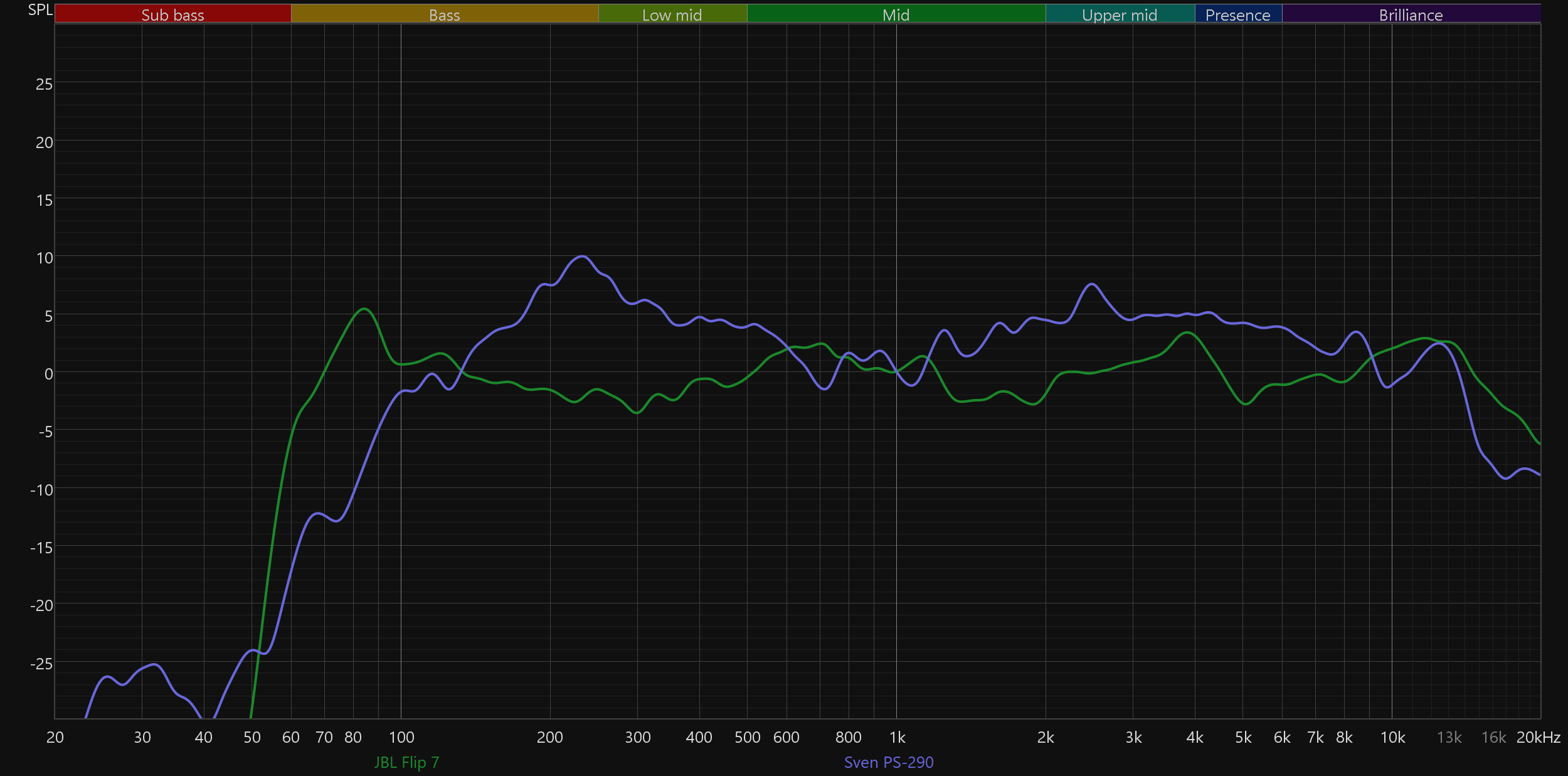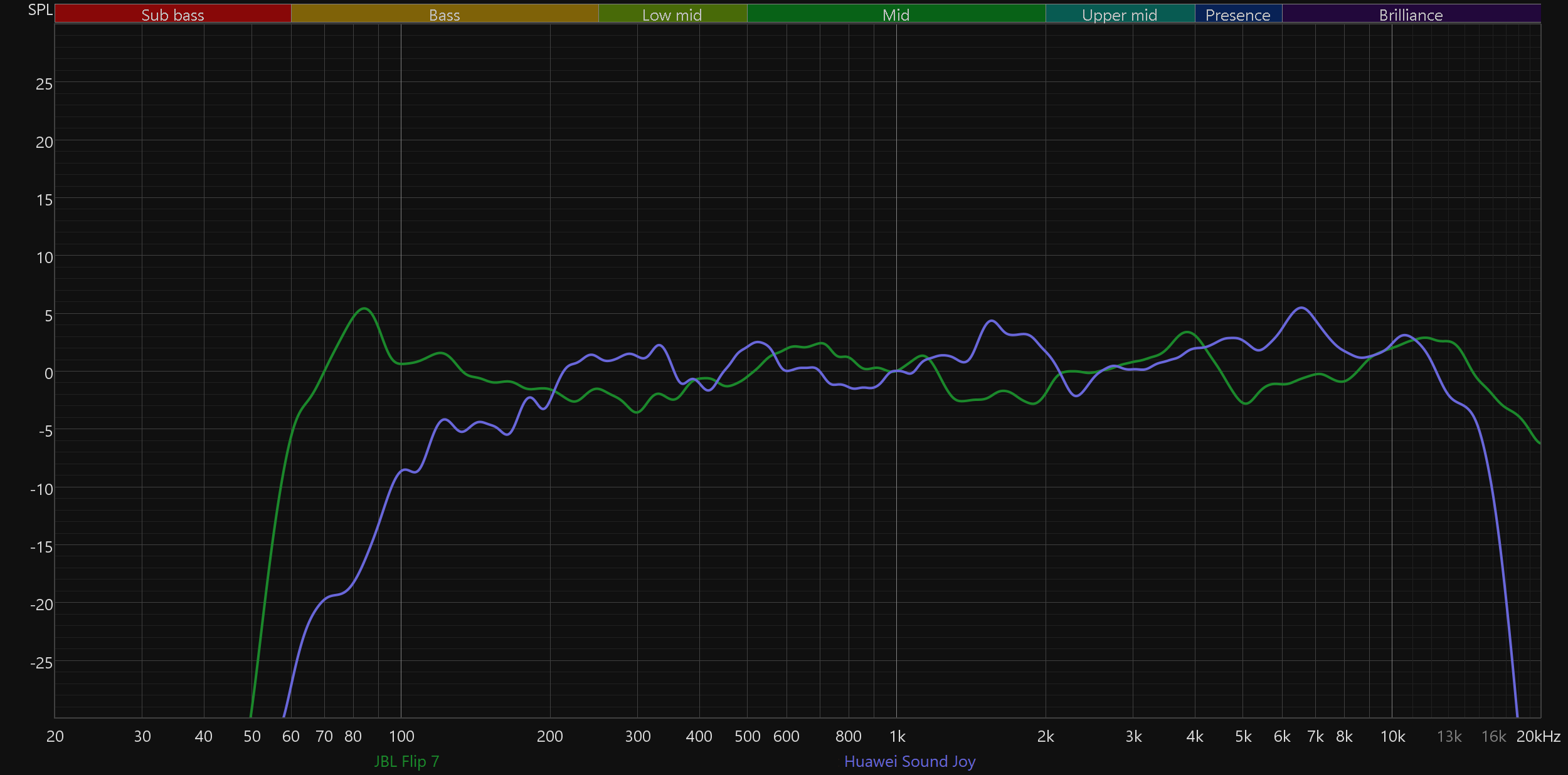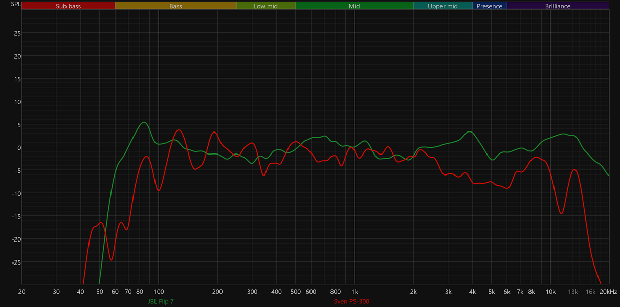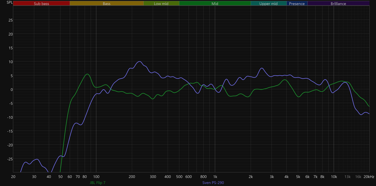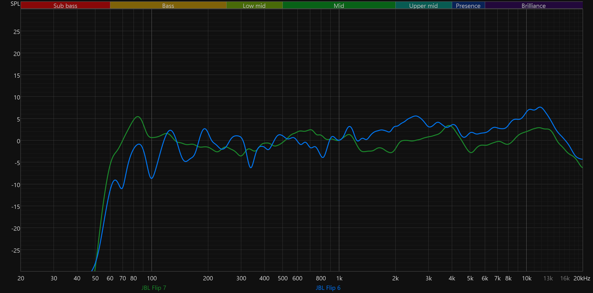 Сравним графики АЧХ новой JBL Flip 7 и прошлой Flip 6 — очевидно, что стало намного лучше: бас получился более объемным и менее гулким, середина подается ровнее и с большим количеством деталей, не стало лишних акцентов в верхних частотах.