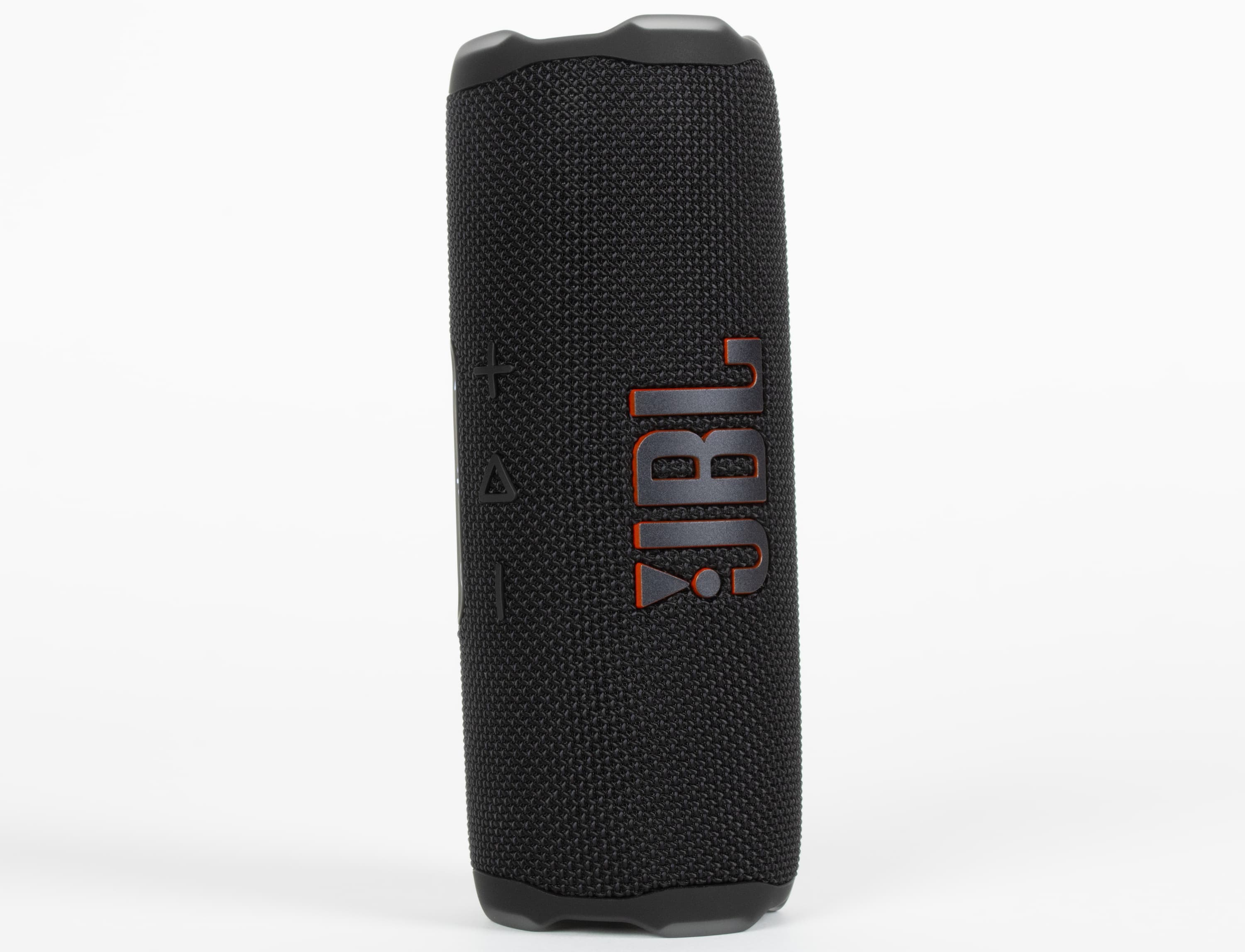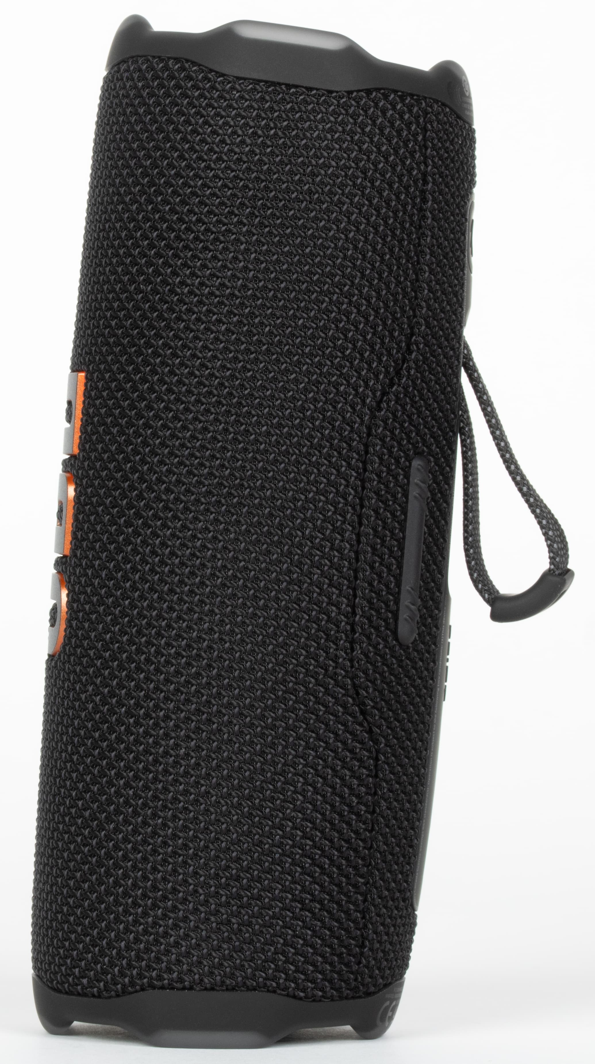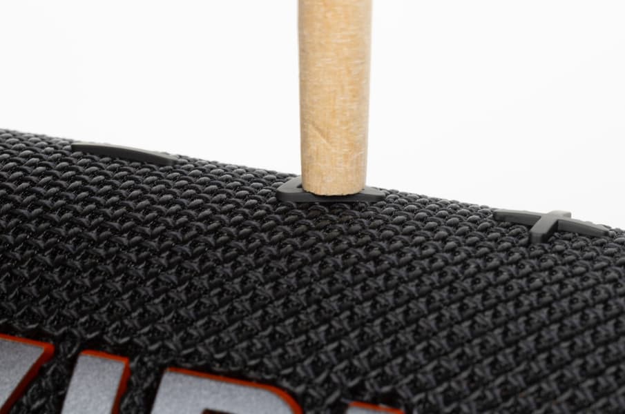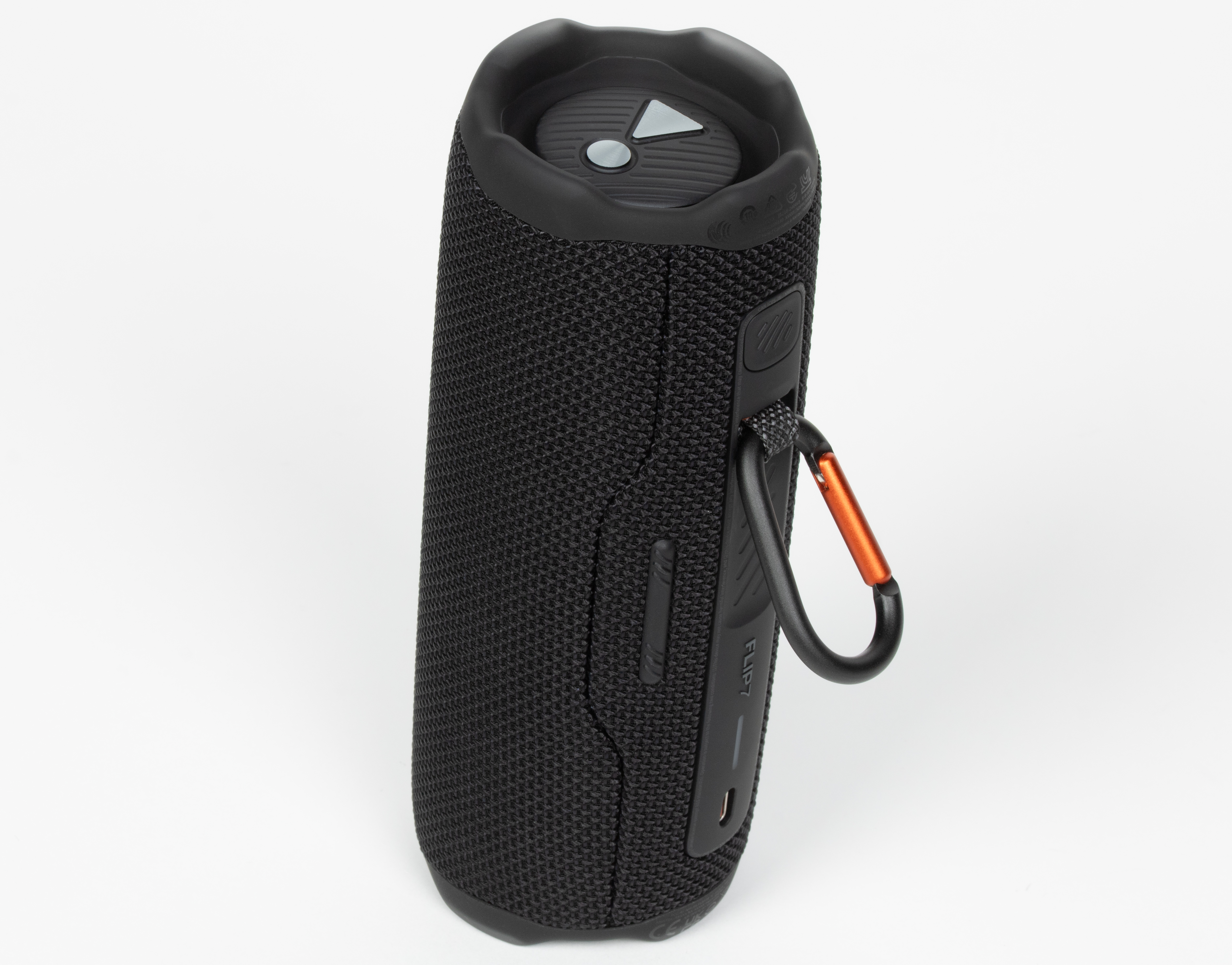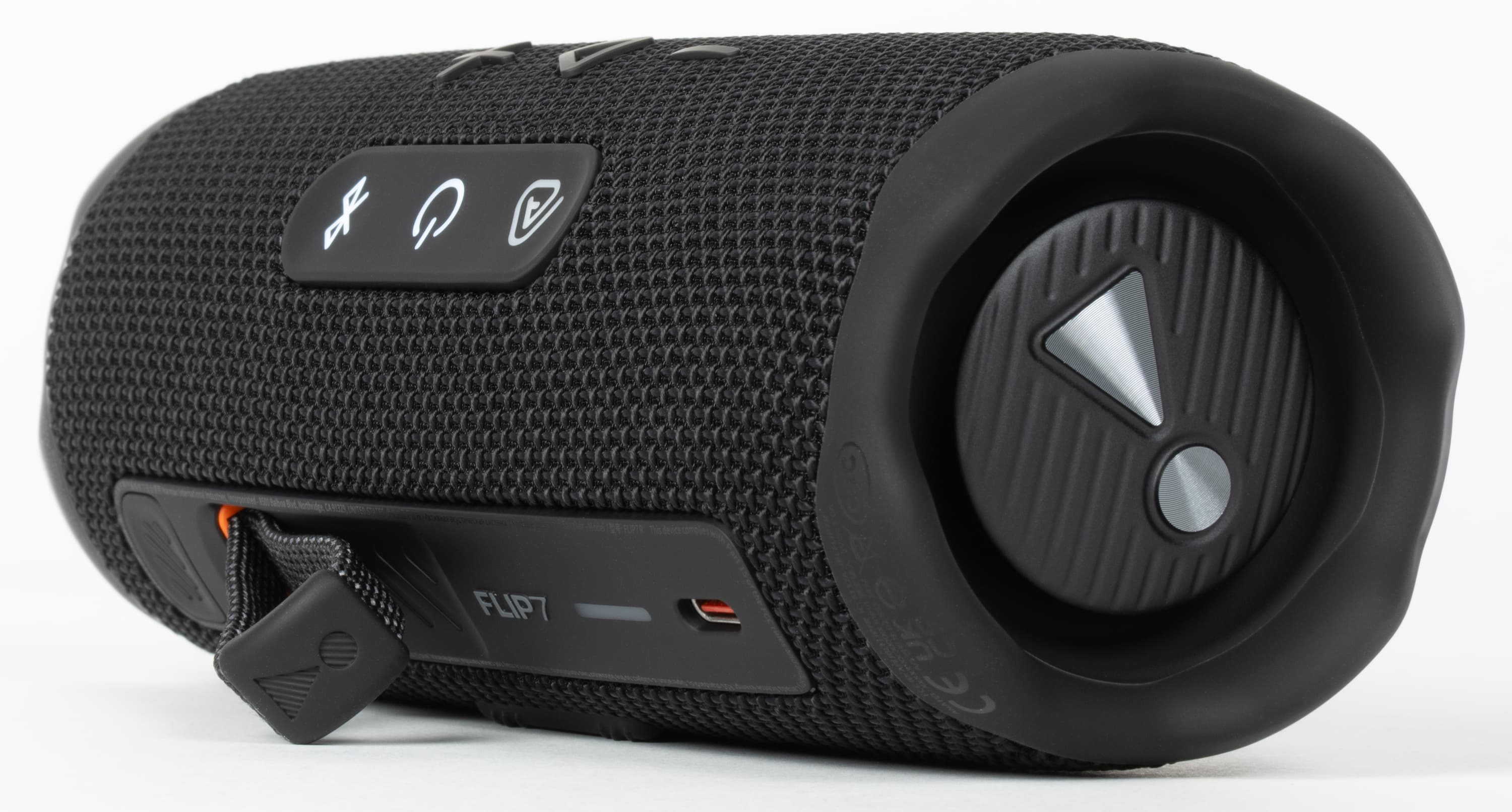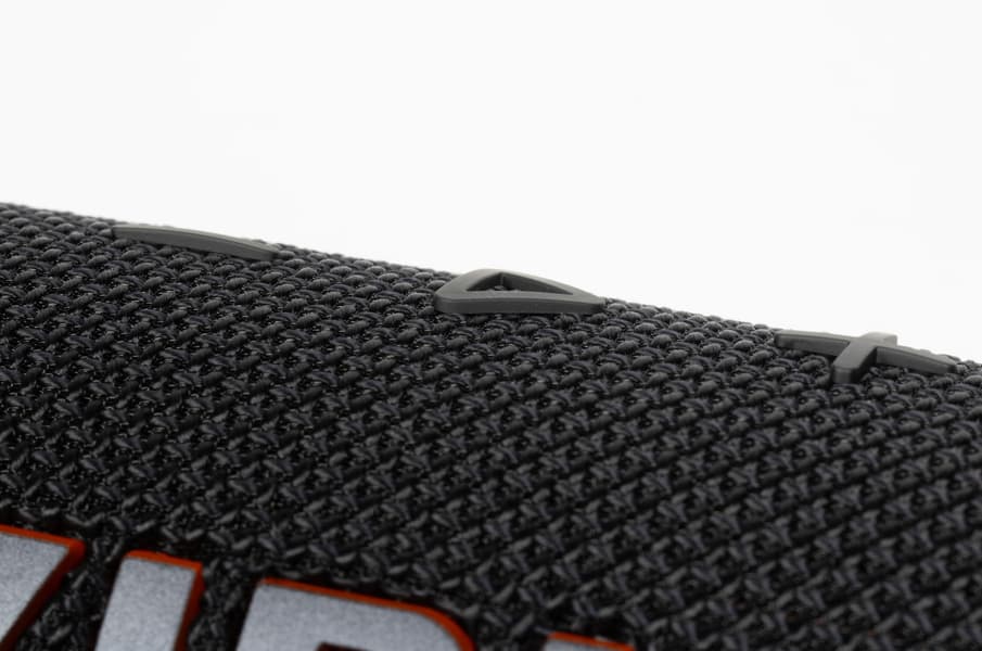 На торцах колонки вновь расположены пассивные излучатели с ходом мембраны около 6 мм. По центру каждого — фирменный восклицательный знак, ставший символом линейки и отсылающий к слогану «Dare to listen!» на коробке. Вокруг излучателей размещены резиновые бамперы, которые одновременно защищают мембрану и позволяют ставить колонку вертикально. Производитель заявляет устойчивость устройства к падениям с высоты до метра на бетон, достигаемую в том числе за счет более массивных бамперов. Их размеры действительно чуть увеличились, но материал, судя по внешнему виду и тактильным ощущениям, остался прежним. Так что есть вероятность, что и предыдущая Flip 6 была не менее прочной, просто тогда маркетологи решили промолчать, а теперь — сделали на этом отдельный акцент в рекламных материалах.