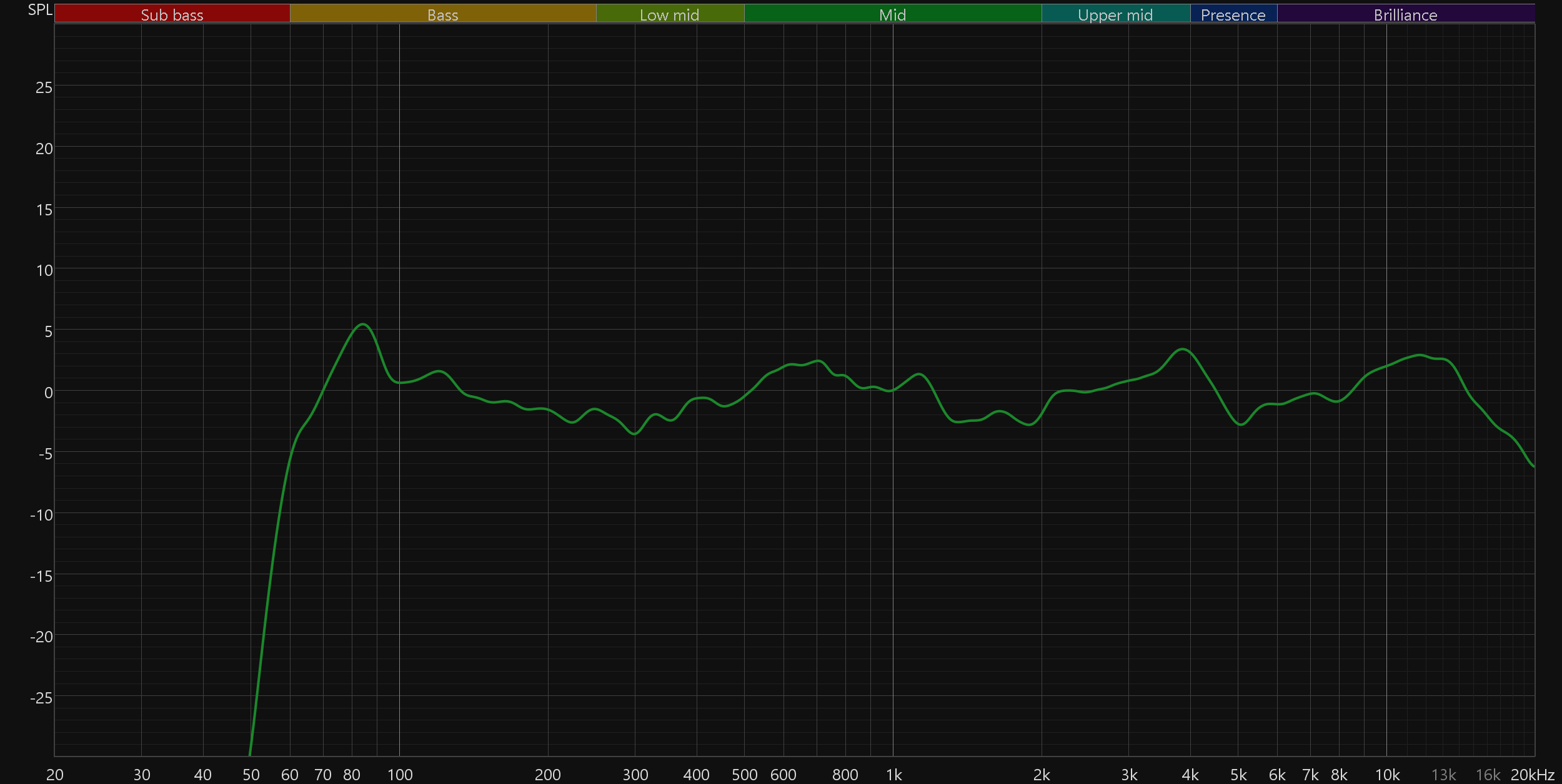 СЧ-диапазон получился удивительно ровным по меркам рассматриваемого форм-фактора. Незначительный акцент в районе 600 Гц делает вокал чуть выразительнее, сохраняя естественный тембр. Подъем около 3 кГц добавляет атаки — перкуссия и вокальные согласные звучат ярче и живее. Небольшое снижение в диапазоне 4—5 кГц сглаживает возможную резкость, хотя местами и создает ощущение легкого «провала» в деталях.