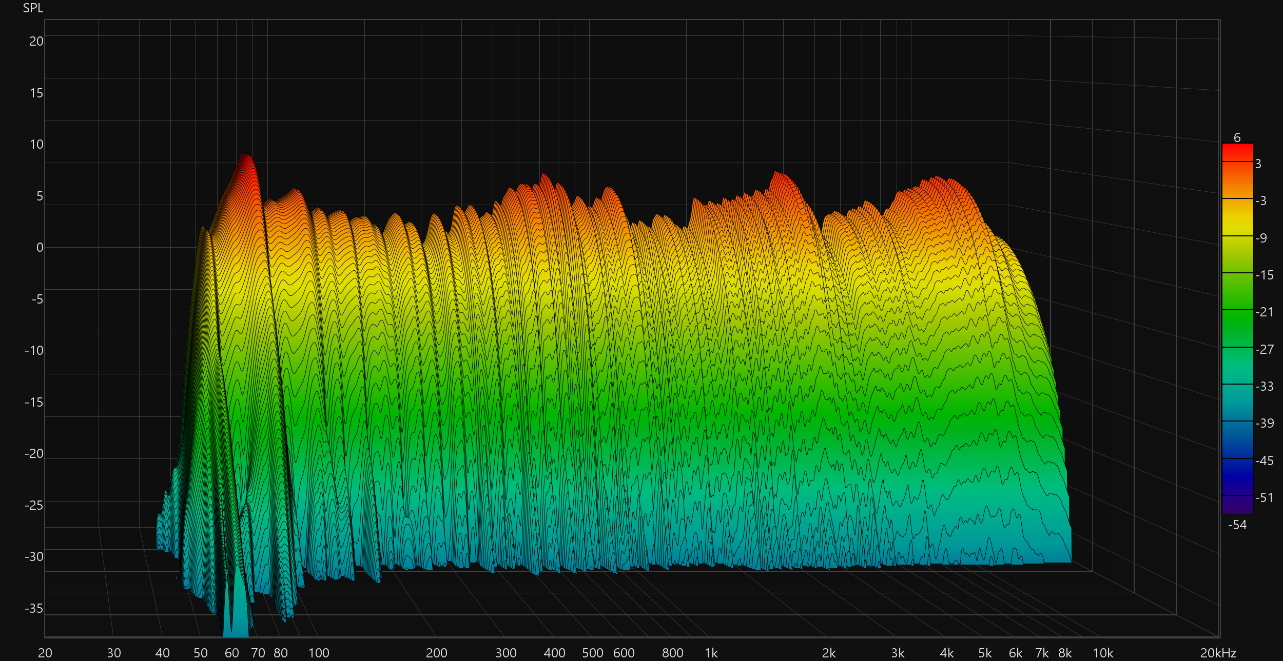 Отсутствие «гудения и бубнения» в НЧ-диапазоне хорошо заметно по графику кумулятивного затухания спектра (он же «водопад» или waterfall).