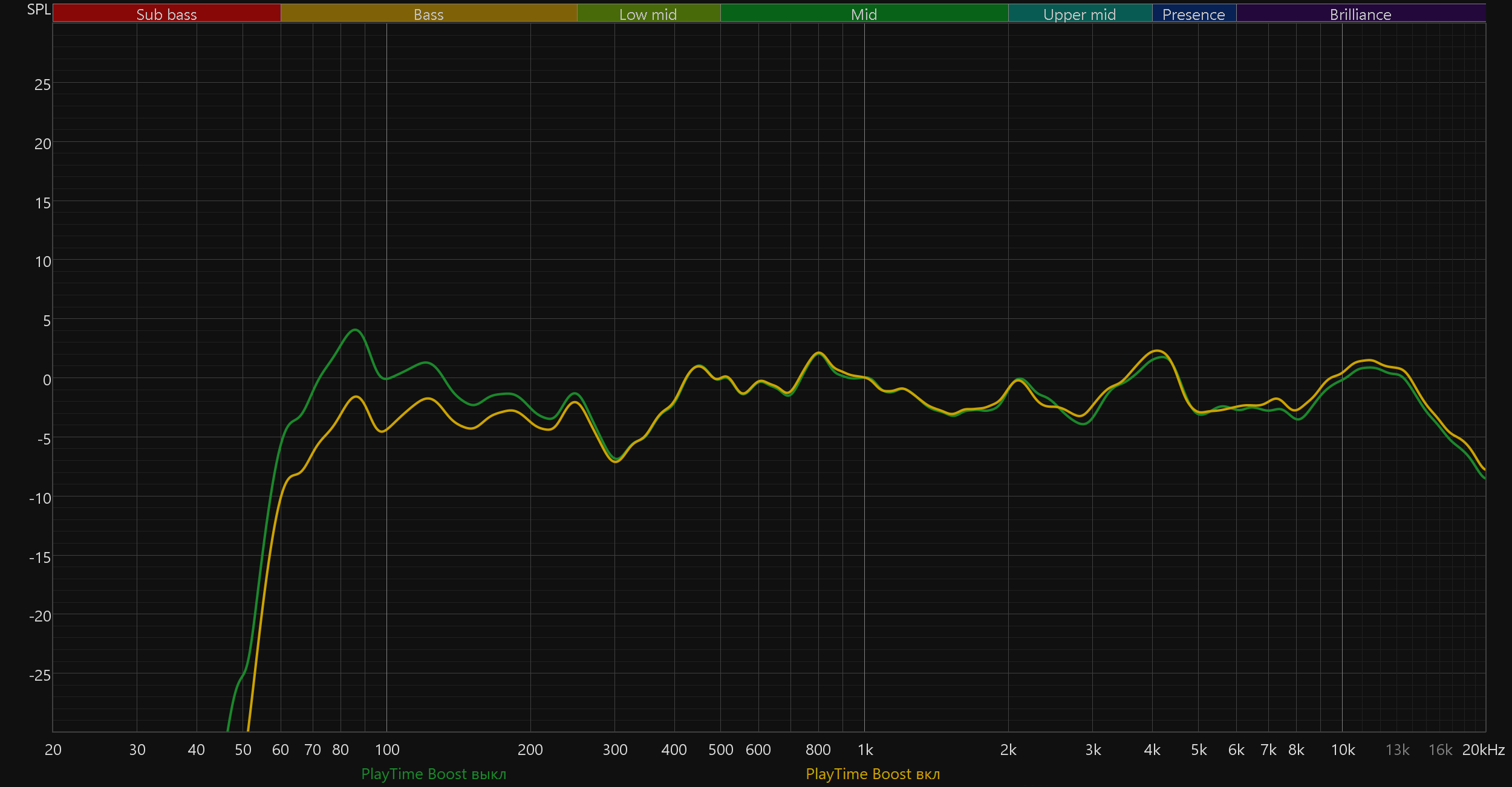 Режим PlayTime Boost действительно позволяет заметно продлить время автономной работы, но делает это ценой ощутимого сокращения объема низких частот. Бас уходит настолько глубоко, что даже тем, кто обычно равнодушен к его количеству, разница покажется слишком очевидной. Эффект воспринимается как осознанная жертва ради автономности, а вот стоит ли она того — вопрос открытый.