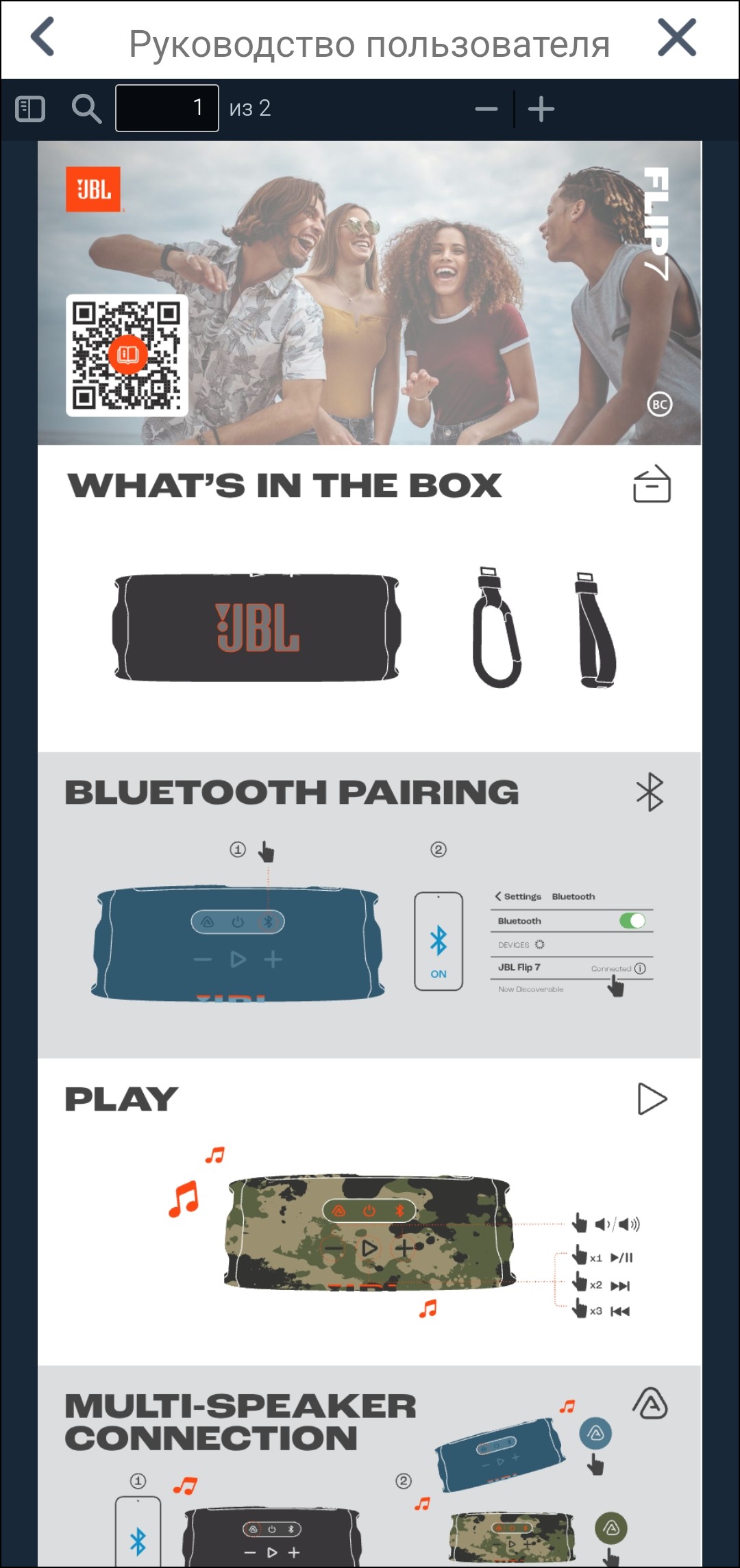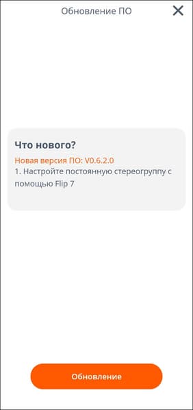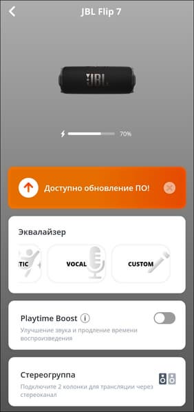 Настройка Flip 7 осуществляется через приложение JBL Portable, которое сразу обнаруживает заранее подключенную колонку и проверяет наличие обновлений прошивки. Если находит — предлагает установить. Занимает этот процесс пару-тройку минут.