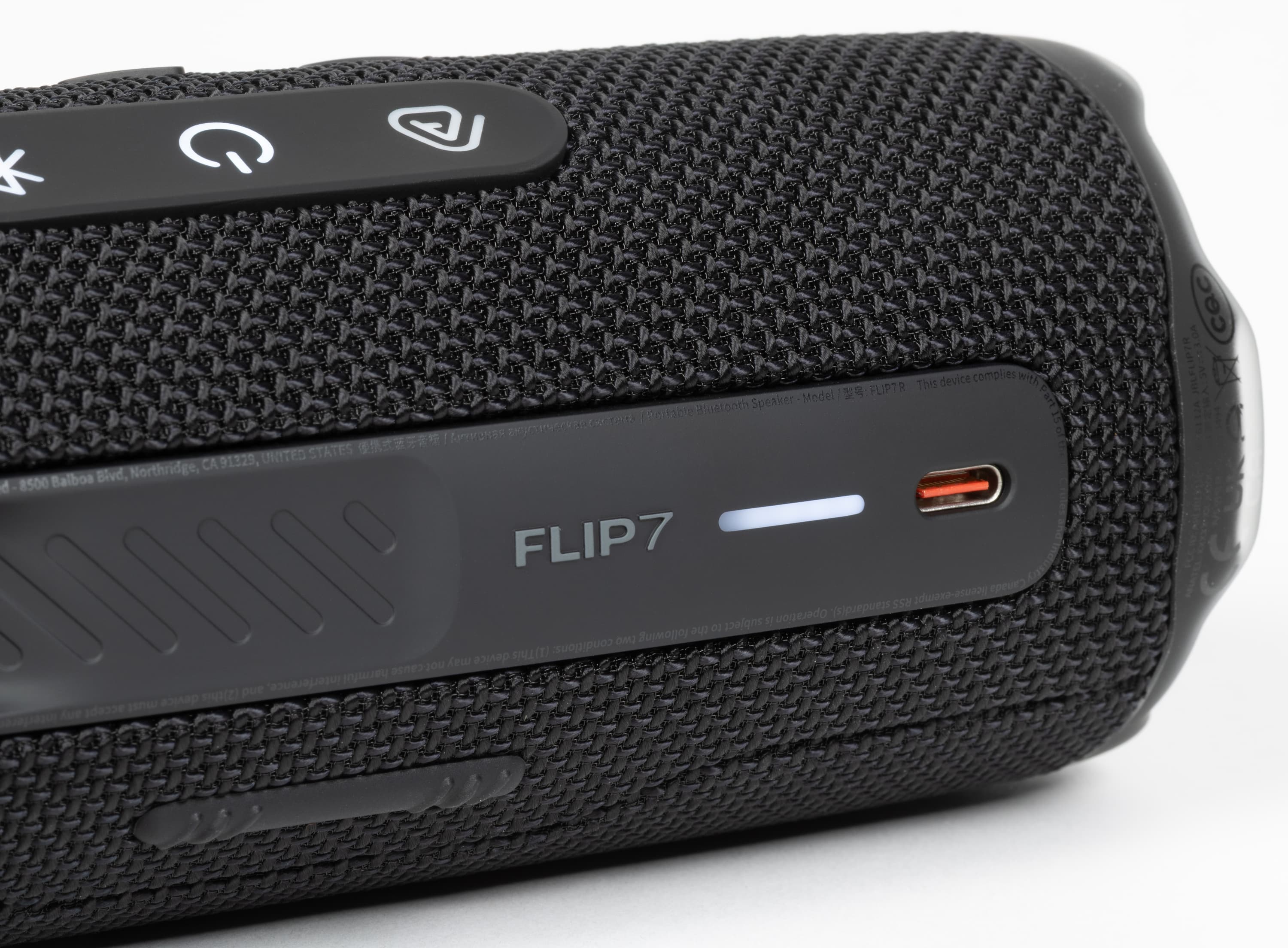 По периметру JBL Flip 7 обтянута прочной тканью, устойчивой к загрязнениям и легко очищающейся при необходимости. Водоотталкивающая пропитка есть — при попадании на поверхность устройства жидкость собирается в капли и стекает, почти не впитываясь. Рядом с кнопками питания и сопряжения на панели расположен порт USB Type-C и небольшой, но достаточно информативный индикатор уровня заряда.