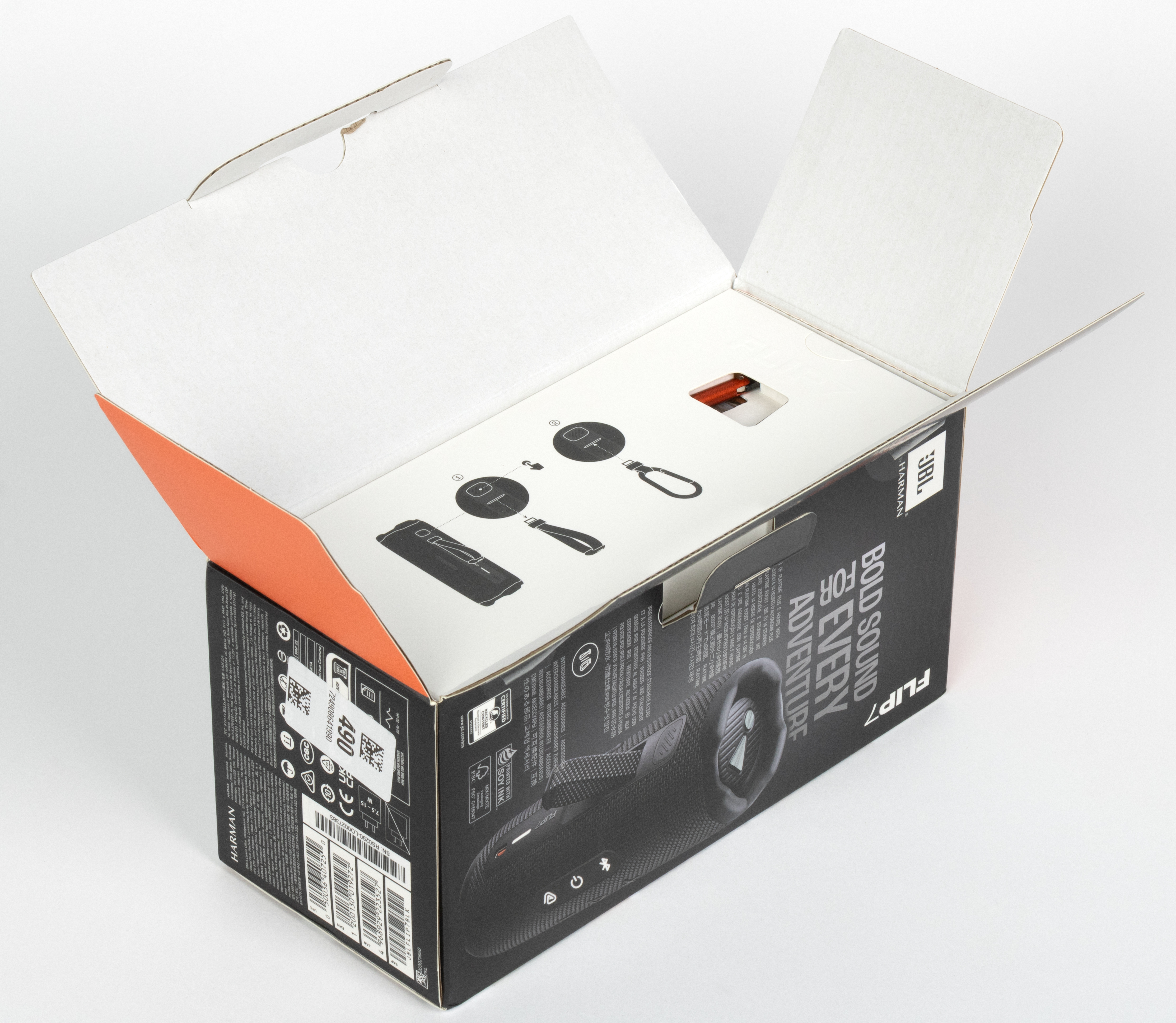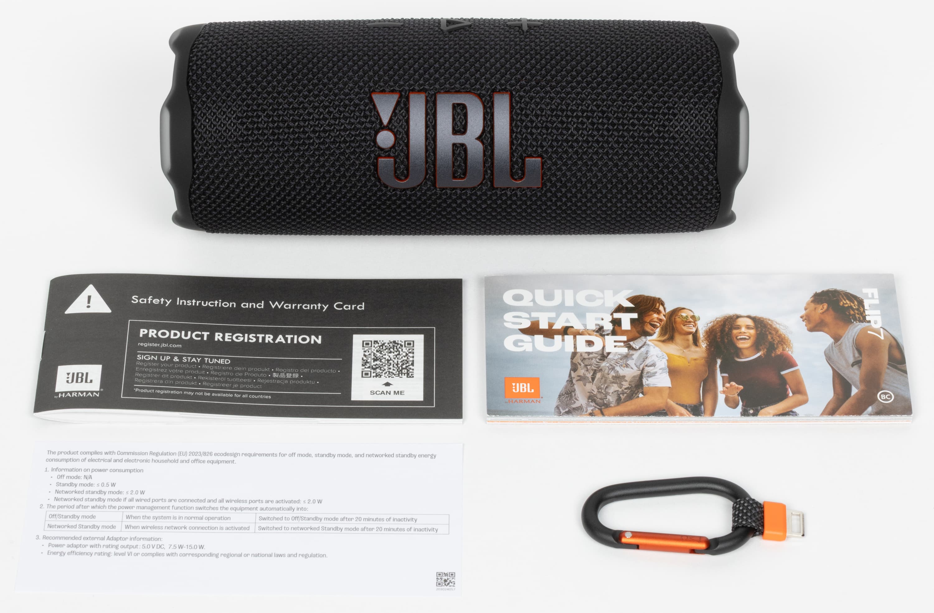 В комплект поставки входят колонка, карабин для крепления, руководство пользователя и гарантийный талон. Традиция не класть в комплект кабель добралась и до JBL. И если в случае с TWS-гарнитурами мы такое даже приветствуем — в них уже давно кладут никому не нужные «коротышки» длиной сантиметров по двадцать, то здесь вынуждены огорчиться. Раньше с колонками JBL шли качественные кабели длиной около 120 см с приятной оплеткой и узнаваемым дизайном — фирменным оранжевым цветом на внутренней части коннекторов. Немного жаль, что теперь их нет.