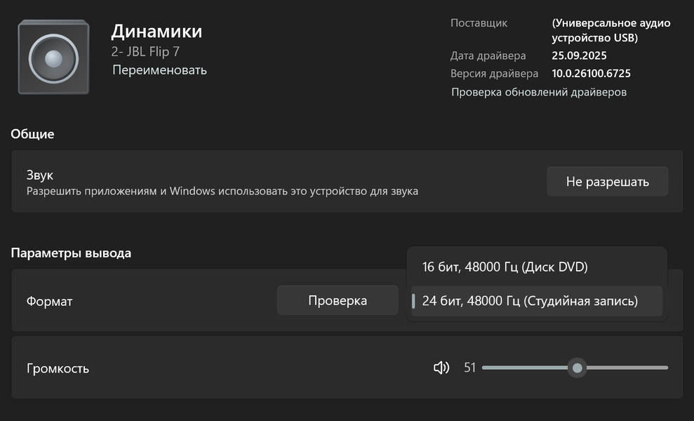 Еще одно важное нововведение Flip 7 — поддержка проводного подключения, впервые вернувшаяся со времен Flip 4. Тогда использовался аналоговый вход mini-jack, а теперь — порт USB-C. При подключении колонка определяется как аудиоустройство и поддерживает режимы до 24 бит / 48 кГц — более чем достаточно для портативной акустики. В ходе тестов мы подключали ее к ПК под управлением Windows и к смартфону на Android, в обоих случаях все отлично работало.