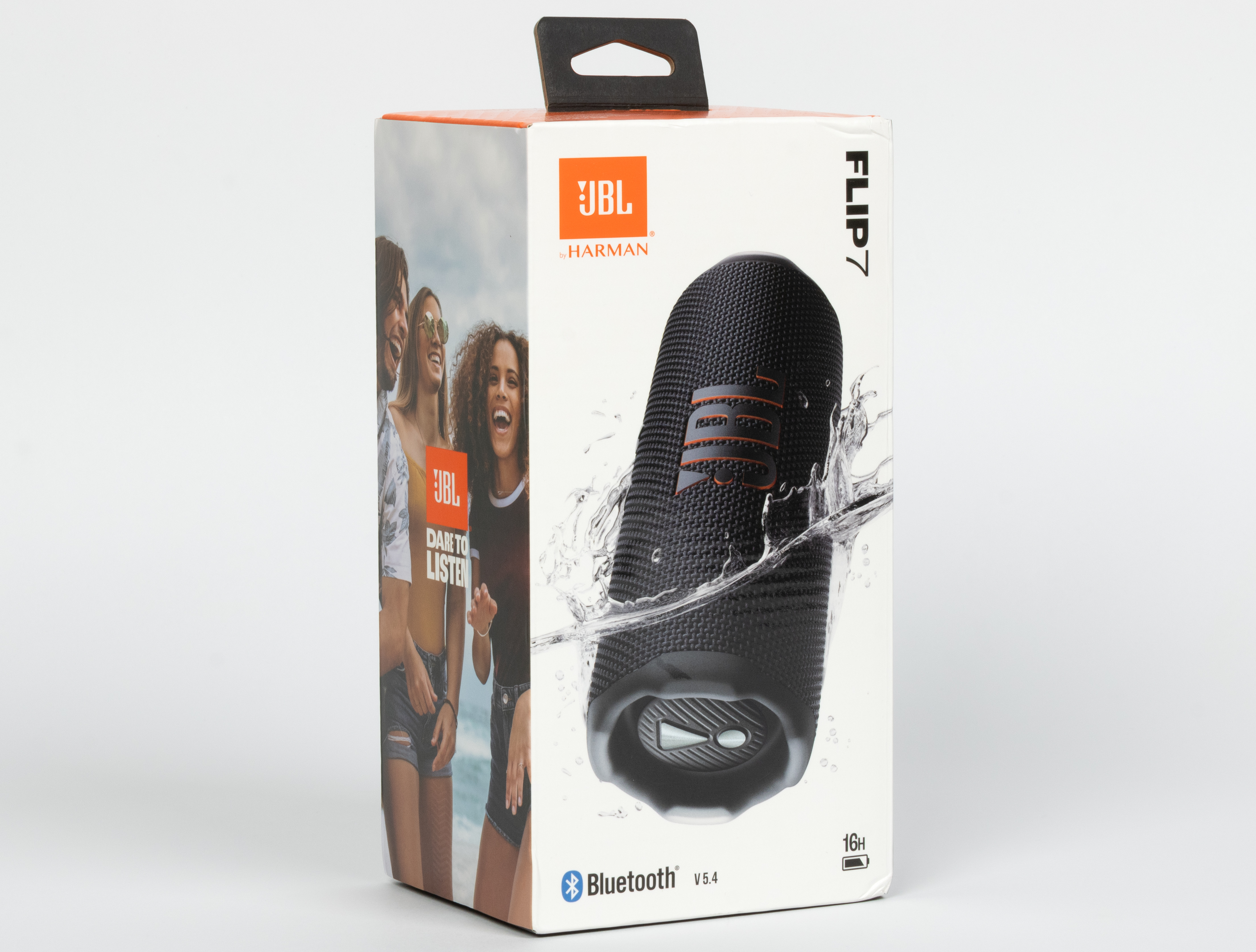 Дизайн упаковки практически не изменился — даже центральное фото выполнено в том же ключе, колонка снова частично погружена в воду. Обновились лишь цифры на значках версии Bluetooth и уровня автономности, а также иллюстрация на боковой панели. На своем месте и слоган «Dare to listen!», который можно перевести как «Решись послушать!».