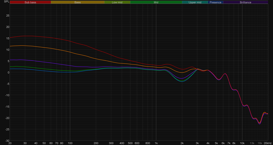 Звучание в целом довольно сбалансированное, но при этом не лишено очень ярких особенностей. Перед тем, как говорить о них, взглянем на графики АЧХ. Для начала немного поэкспериментируем с регуляторами баса — на них есть пять делений, сравним графики в каждой из позиций.
