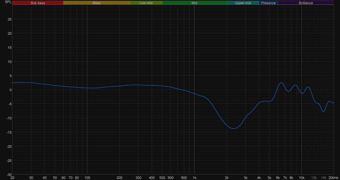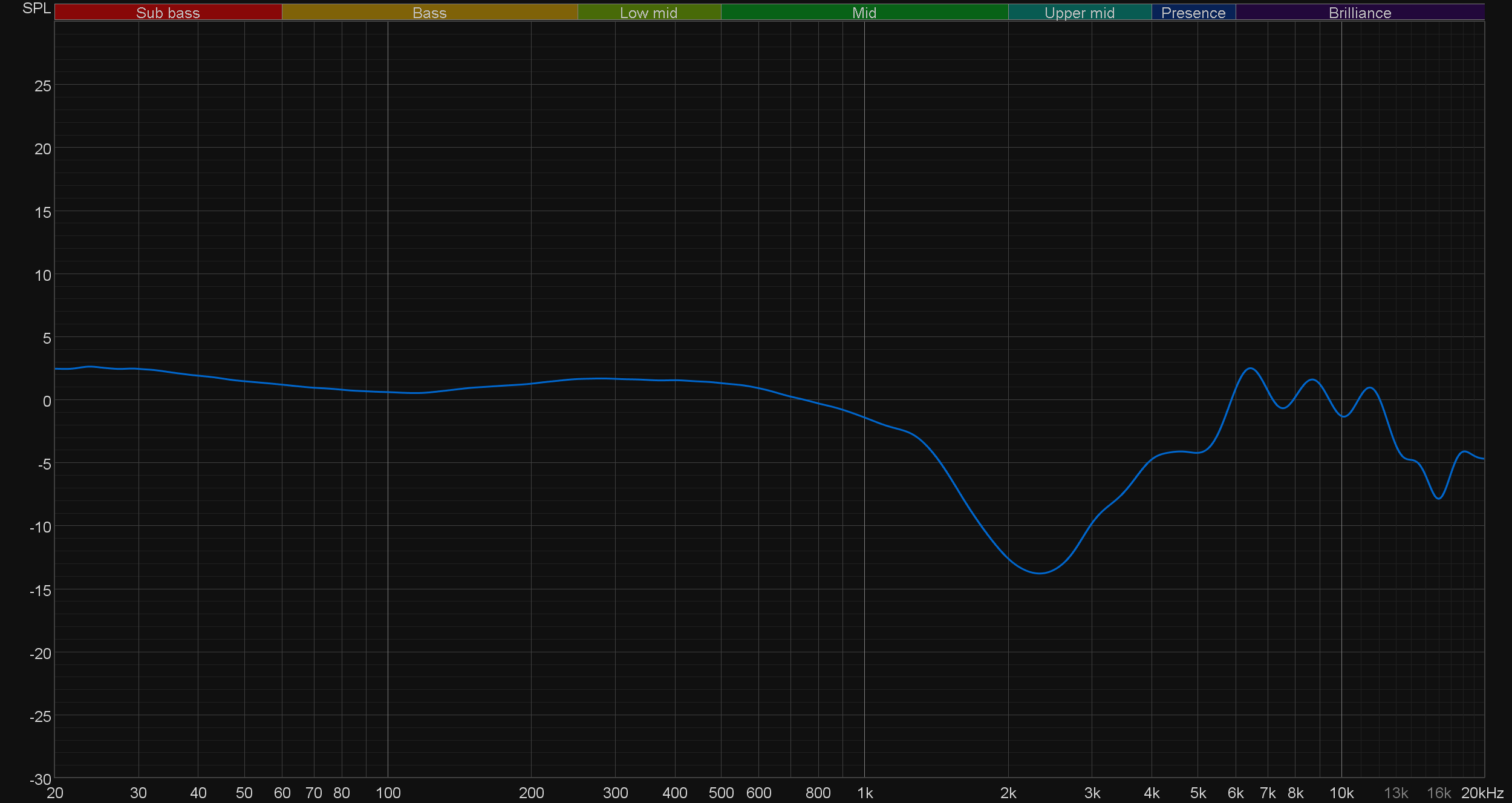 И вот мы видим основательный провал в районе верхней середины. Сразу нужно отметить, что на деле он не так заметен, как на картинке. Но все-таки он существует, вокальные партии звучат иногда слишком «сухо», хотя большой проблемой это не становится — благодаря описанным выше преимуществам и сбалансированному в целом звучанию, общее впечатление от наушников остается отличным.