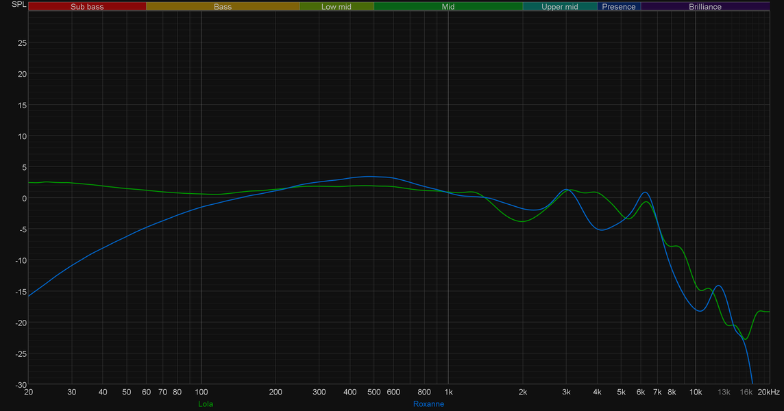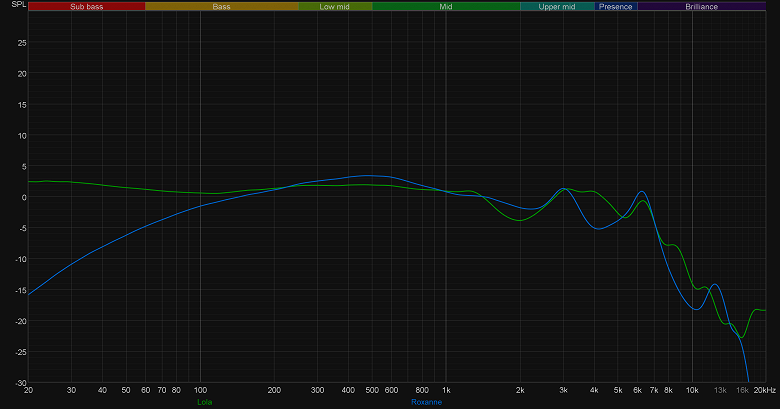 Ну и под конец разговора нельзя не сравнить звук JH Lola и протестированных ранее Roxanne. Если в случае с последними мы говорили про аналитическое звучание, буквально «препарирующее» трек на составные части, то в случае Lola упор сделан на музыкальность и эмоциональность звучания. Про особенности АЧХ отдельно говорить не будем — все прекрасно видно на графике ниже. Сравниваем мы, конечно же, графики с одинаковым положением регулятора на кабеле.