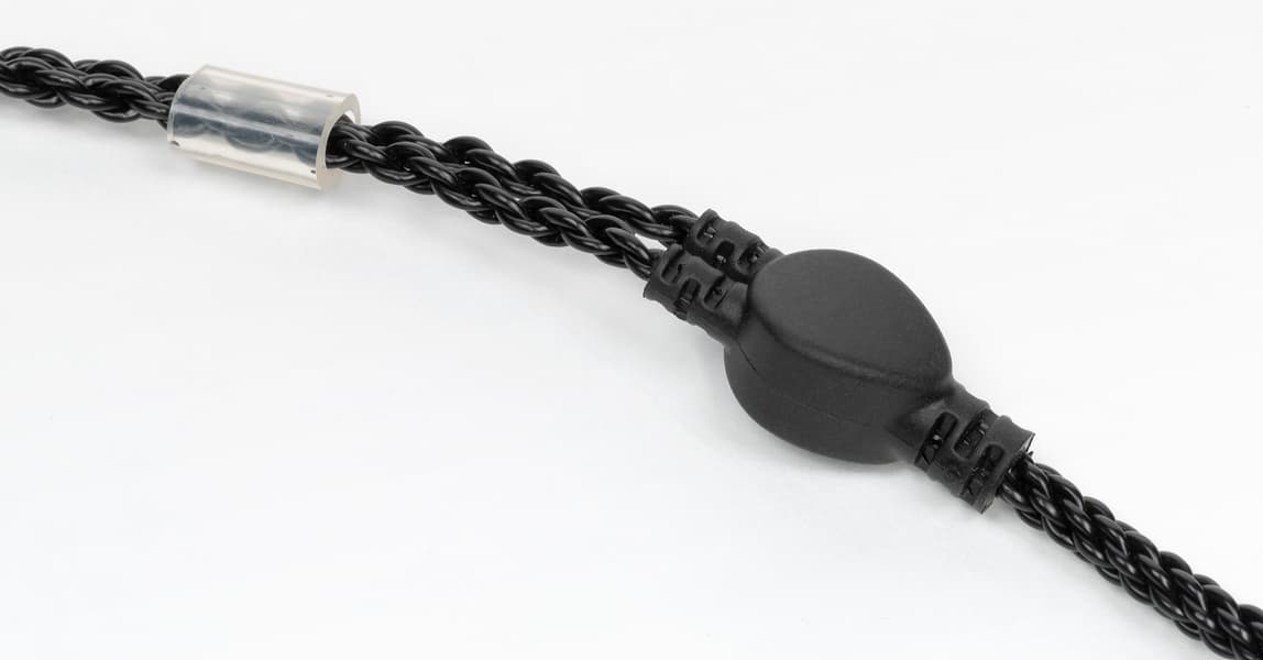 Место деления кабеля укреплено специальным пластиковым элементом, над ним расположен прозрачный «бегунок».