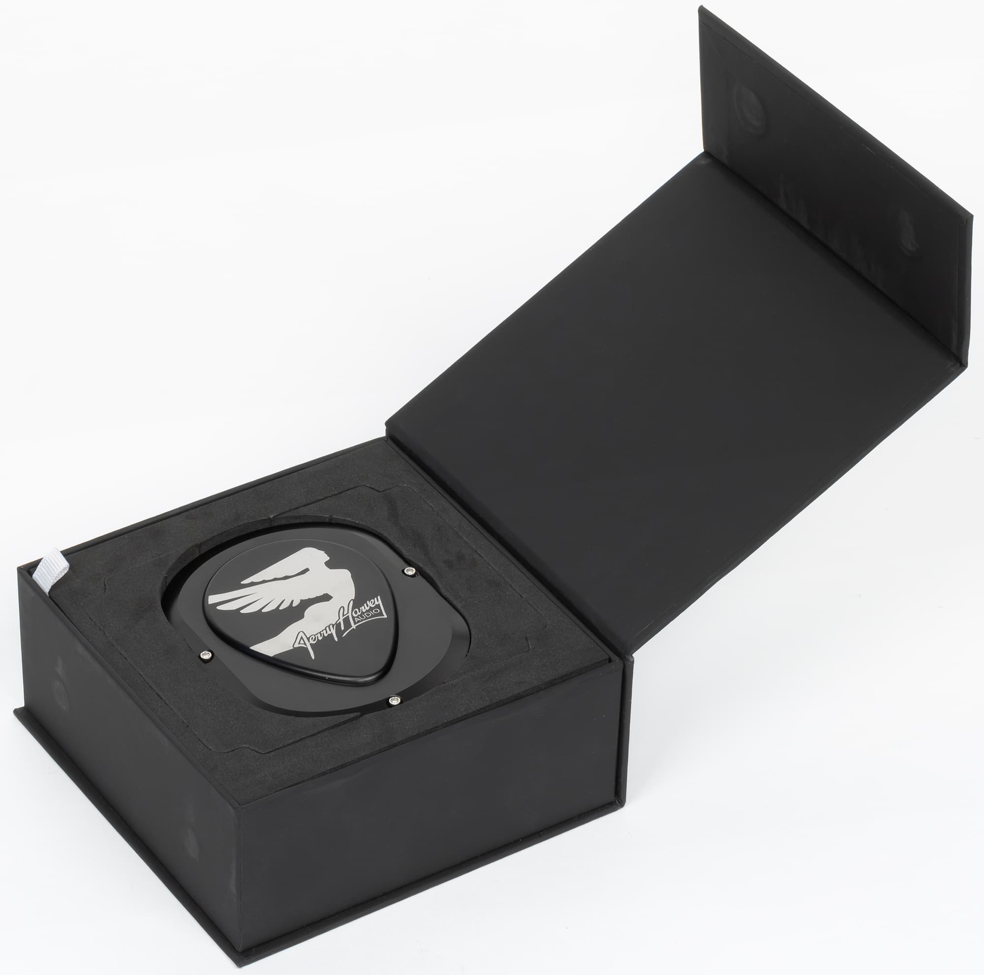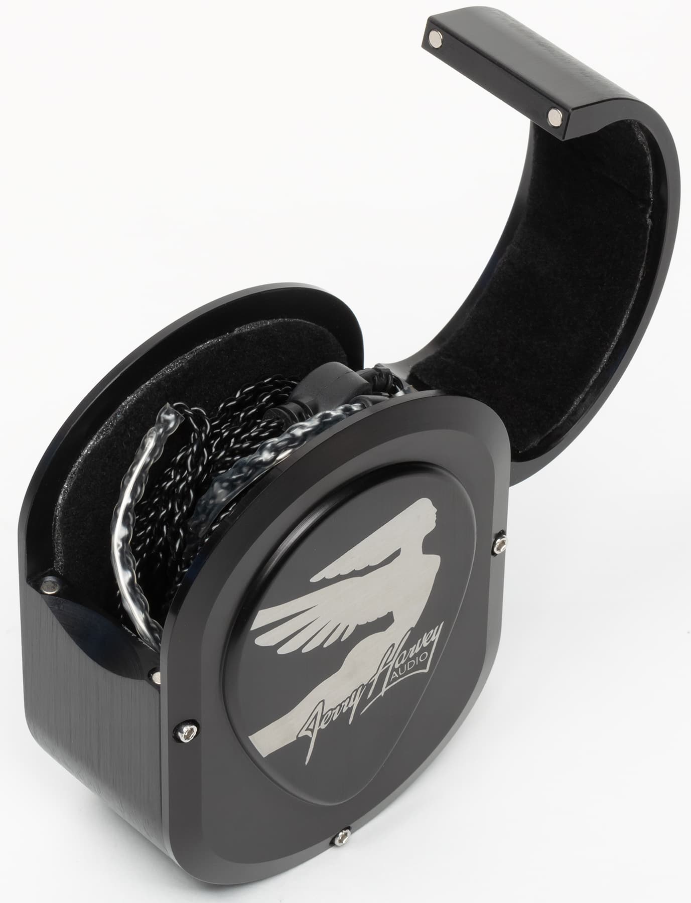 Дизайн солидный, даже строгий, но при этом очень привлекательный. Поставляются наушники в кейсе, о котором мы поговорим отдельно. Кейс в свою очередь закреплен в ложементе внутри коробки из плотного черного картона с откидывающейся крышкой.
