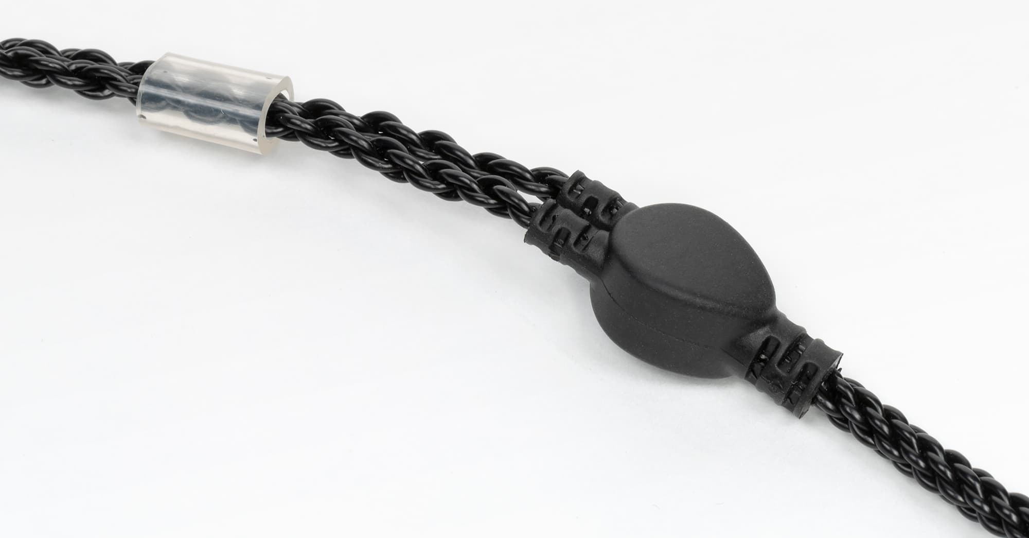 Звуковод длинный — порядка 10 мм, выходит из корпуса под углом. Его диаметр — 5,5 мм, потому насадки с внутренним отверстием порядка 4 мм надеваются на него с заметным усилием. В итоге, несмотря на отсутствие углубления для их фиксации, держатся они надежно. Крепление для кабеля также имеет весьма внушительный размер — его диаметр составляет 5 мм.